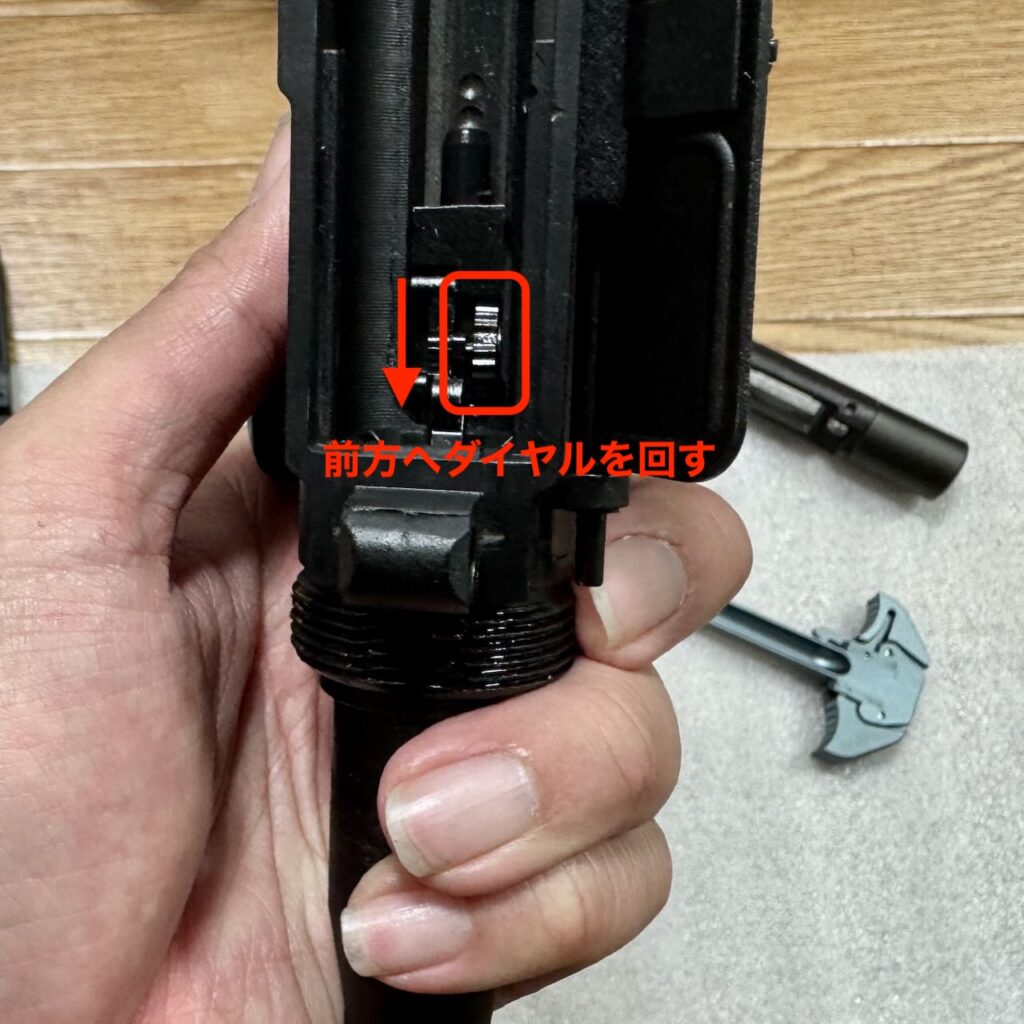バレル内部にあるチャンバー側のホップレバーとアッパーフレーム側のホップレバーの引っ掛かりをなくすためにホップダイヤルを前方へ回してホップレバーを完全にゆるめる。