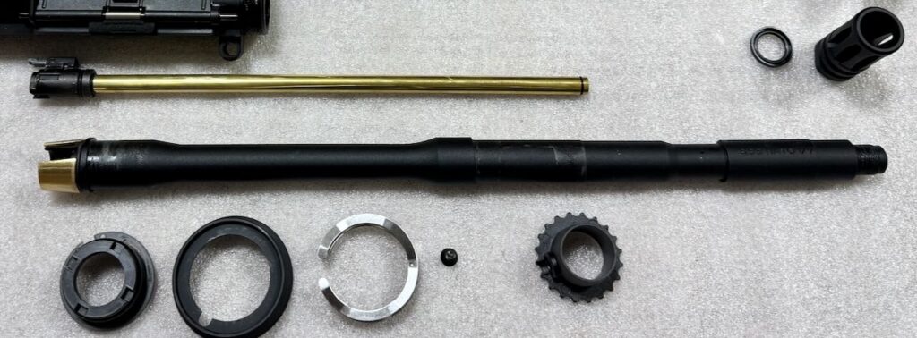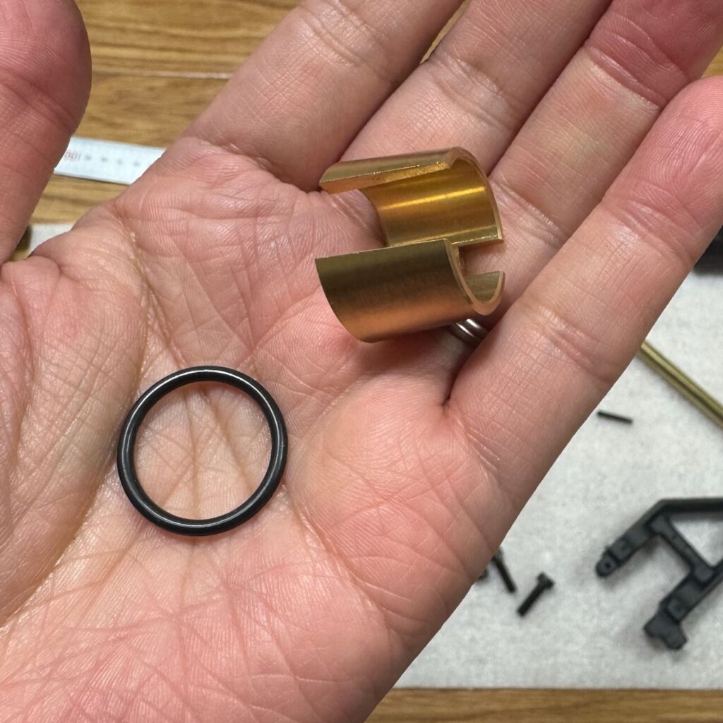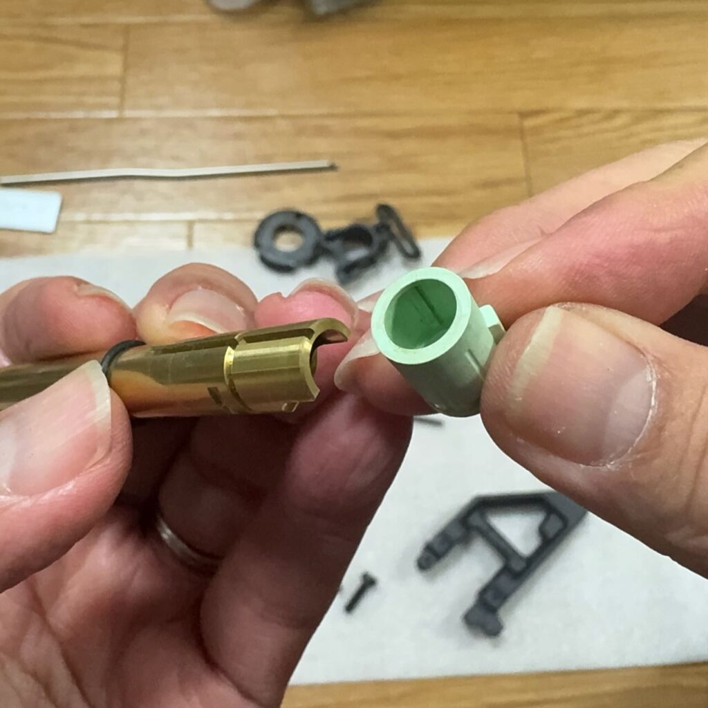 アウターバレルの根元には、アッパーフレームにピッチリガッツリはめこむ形状をしたバレルコレットが付いている。これも新調した。Oリングも付属しているG&Pのバレルコレット。