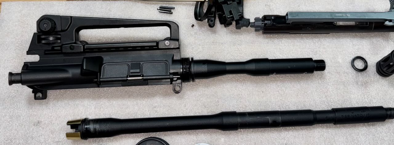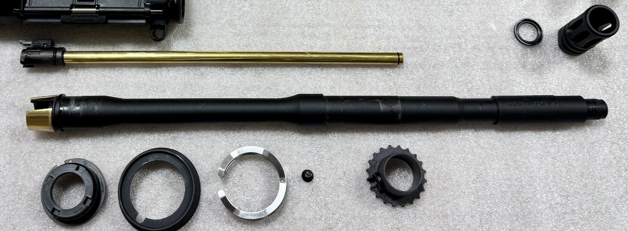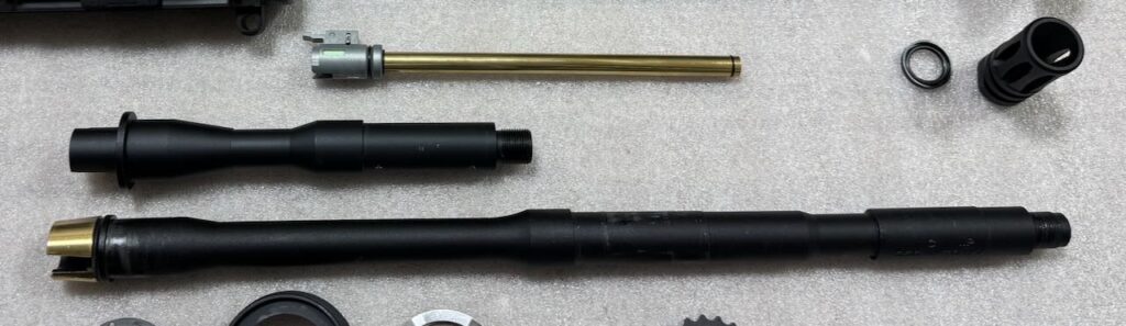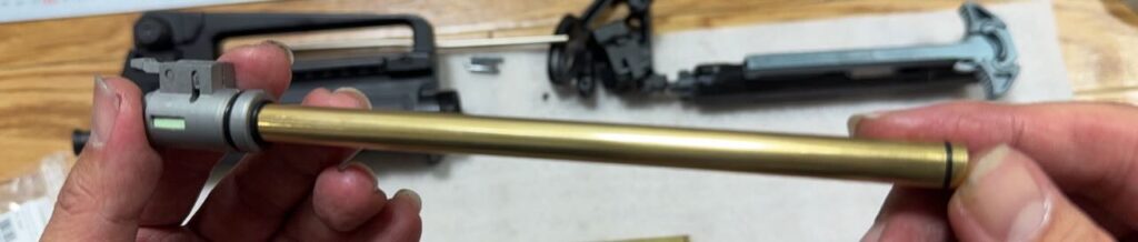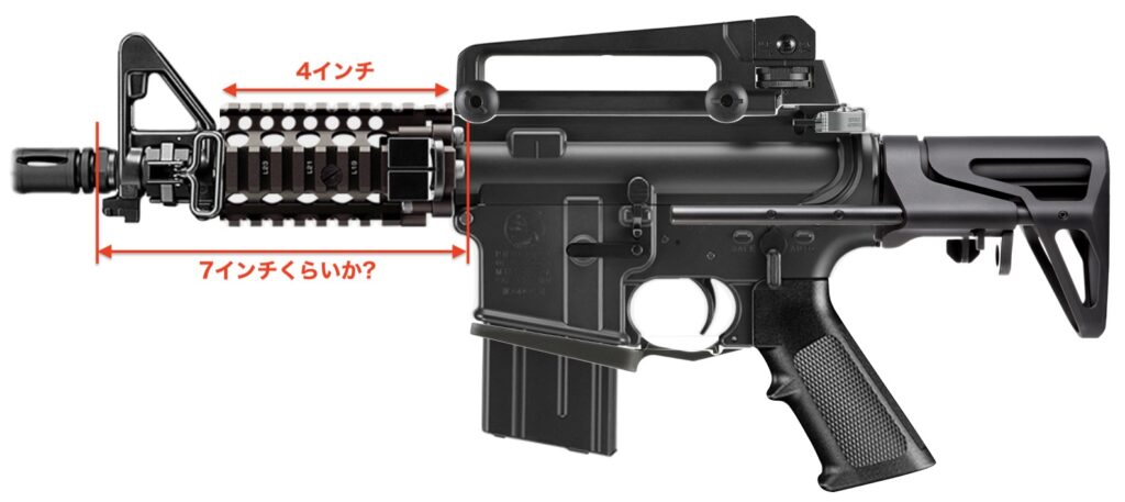 今回は4インチハンドガードの前方に M4A1 カービン付属のフロントサイトを流用する計画。4インチハンドガードとフロントサイトの長さを合計するとバレル長は7インチがちょうど良さそう。バレル長が7インチということはインナーバレルは 160mm 前後がいい。