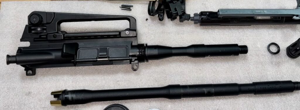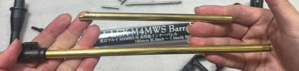 M4A1 カービンに入っているインナーバレルは長さ250mm。これを160mmのものに交換する。買ったのは ORGA LEX05バレル 内径6.05mm マルイ M4MWS用 160mm(6.3~7.5inch)。