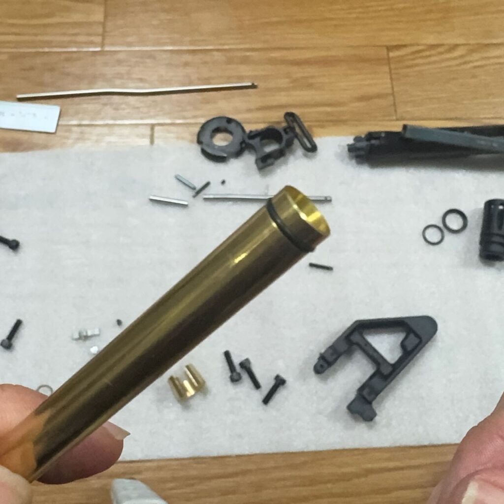 組み上げたインナーバレルをアウターバレルの後ろから差し込む。インナーバレルにつけているOリングがアウターバレルの中でピッタリしてグラグラしない。ピッタリすぎて挿しこみにくいのでOリングにほんのちょっとシリコングリスを塗った。