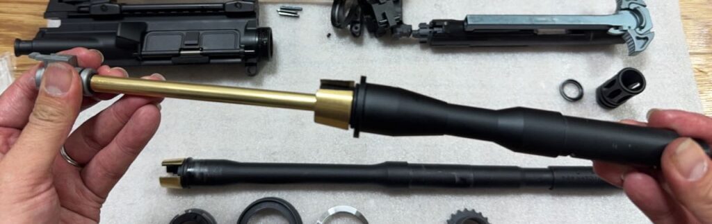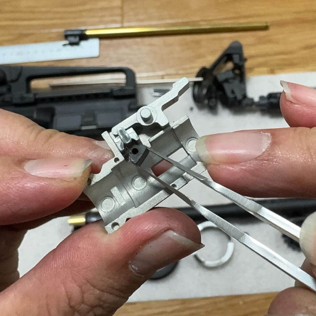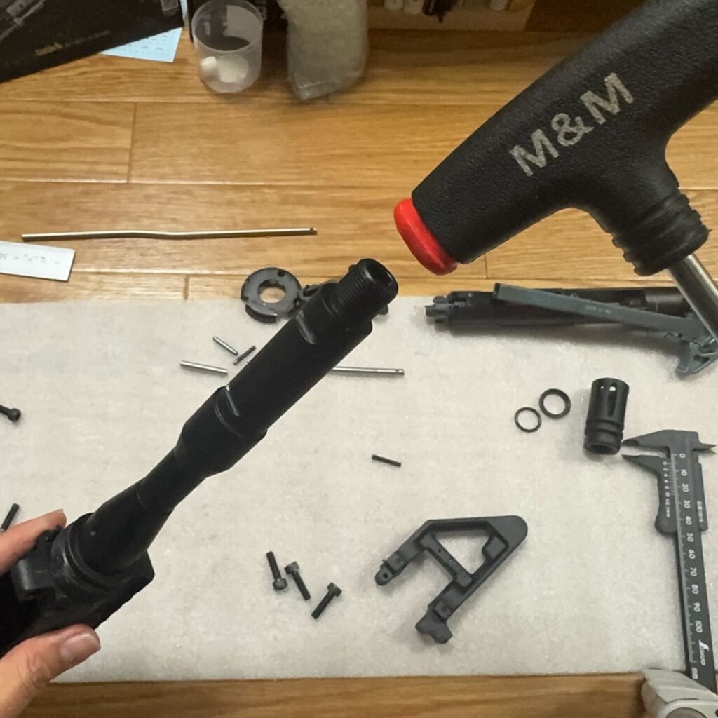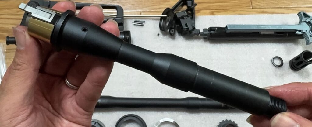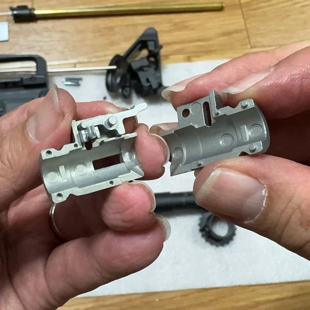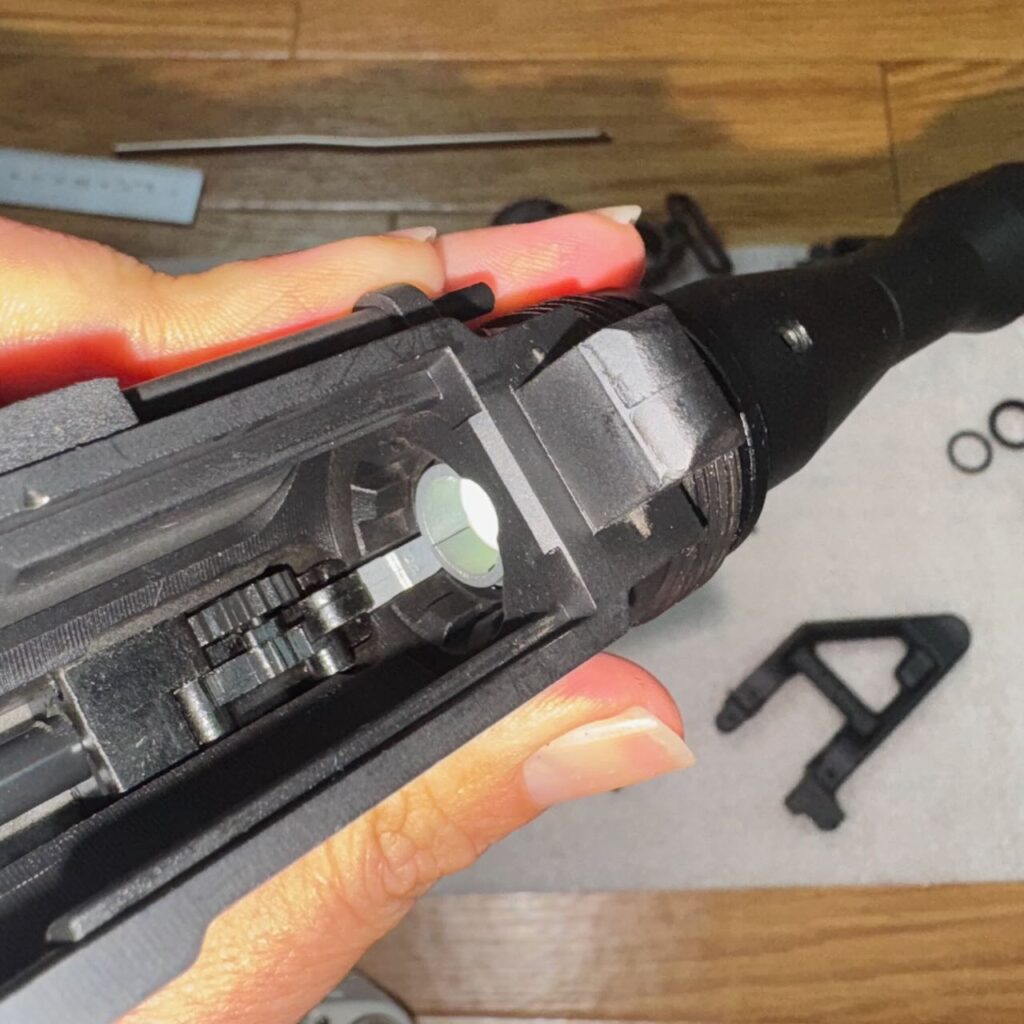 バレルはアッパーフレームにガッチリはまっているので、引き抜くのが難しかったらバレルの先の方を軽〜くコンコンするとゆるんで抜きやすくなる。ちょっと揺らしながらまっすぐ抜く。
