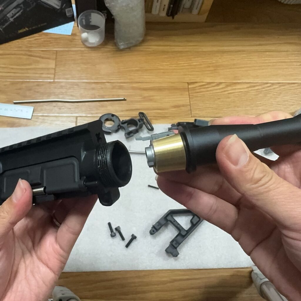 組み上げたバレル一式をアッパーフレームに差し込む。チャンバーのホップレバーBが、アッパーフレームのホップレバーAの下にはまり込むことを確認する。ホップ調整ダイヤルを最弱にしておけばすんなり入るはず。レバー同士がちゃんと噛み合ってることを確認したら、銃口をコンコン叩いてきっちりバレルを押し込んでバレル交換完了。