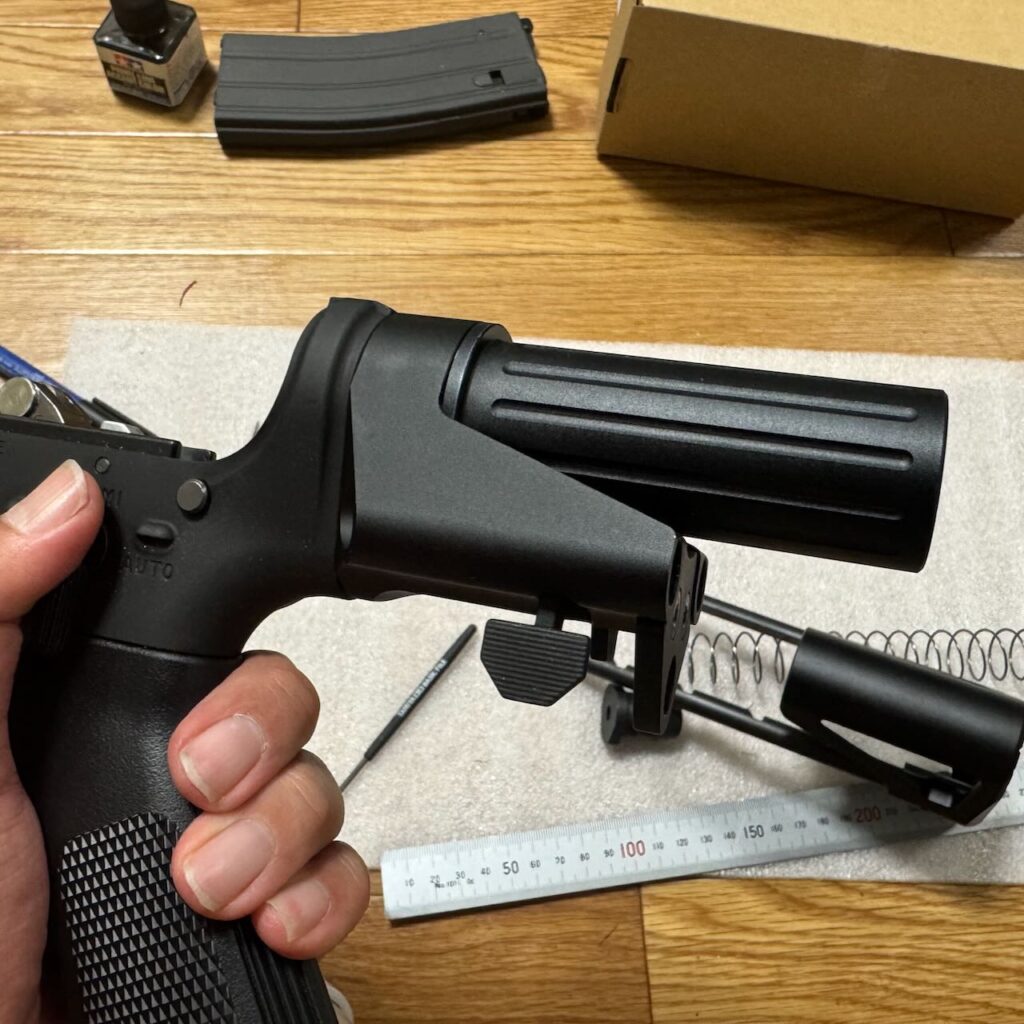 さて、いよいよ最終段階。長ーい、長ーい、得物。厨二心を鷲掴みの超ロング火炎放射器。火炎放射器がこんなに長い必要あるんか?あるんだ。きっと。デカイけどパーツ構成は比較的簡素。前方と後方の内部フレームをモナカ構造で作って、これまたモナカの半透明外装をかぶせて、アルミ棒で前後を連結って感じ。説明書通りにサクサクっと切り出して塗装してデカール貼ってトップコート塗って組み立て。