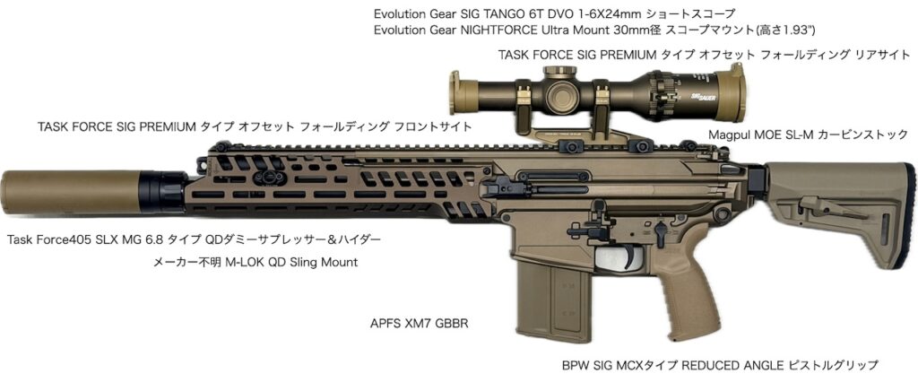 茶系のエアガンは色味や光沢感の幅が広すぎて、たとえDEとかFDEとかTANとか同じ色名で合わせても、全然色が合わないことが多い。しかも写真だとホワイトバランスのちょっとした違いで同じものが全然違う色に見えちゃう。ネットショップの画像はまったくあてにならないので、実店舗に行って自分の目で確かめる必要がある。ネットでは M7本体がSIG SAUER社製なのでスコープもSIGの TANGO 6T にしてる写真があったけどこれのレプリカはすでに KS-1 に乗せてるからかぶるし、ELCAN Specter DR 1-4 を乗せてるのもかっこいいけどこれのレプリカはすでに Mk18 mod.1 に乗せてるからかぶる。いくつかの店舗をまわって、最終的にHOLY WARRIOR の VORTEX RAZOR HD GEN2-E 1-6X24 LPVO ショートスコープ DE とノーベルアームズのAR-15 Hi-Mount Height FDE(30mm/1inch) にした。