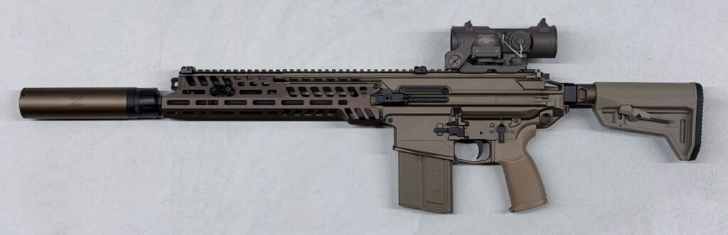 茶系のエアガンは色味や光沢感の幅が広すぎて、たとえDEとかFDEとかTANとか同じ色名で合わせても、全然色が合わないことが多い。しかも写真だとホワイトバランスのちょっとした違いで同じものが全然違う色に見えちゃう。ネットショップの画像はまったくあてにならないので、実店舗に行って自分の目で確かめる必要がある。ネットでは M7本体がSIG SAUER社製なのでスコープもSIGの TANGO 6T にしてる写真があったけどこれのレプリカはすでに KS-1 に乗せてるからかぶるし、ELCAN Specter DR 1-4 を乗せてるのもかっこいいけどこれのレプリカはすでに Mk18 mod.1 に乗せてるからかぶる。いくつかの店舗をまわって、最終的にHOLY WARRIOR の VORTEX RAZOR HD GEN2-E 1-6X24 LPVO ショートスコープ DE とノーベルアームズのAR-15 Hi-Mount Height FDE(30mm/1inch)にした。