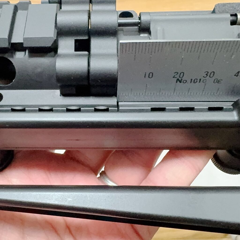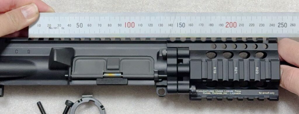 バレルナットを使わずにハンドガードを軽く組み立てて、アウターバレルに挿し込む。アッパーフレームとハンドガードをピッタリくっつけた状態で定規をあててアッパーフレーム後端のミゾからハンドガード先端のミゾまで長さを測ると20mm間隔にしては0.5mmほど短い。つまり、アッパーフレームとハンドガードとの間に0.5mmくらいの隙間を作るとピカティニーレールとしての連続性がピッタリコンの位置のようだ。