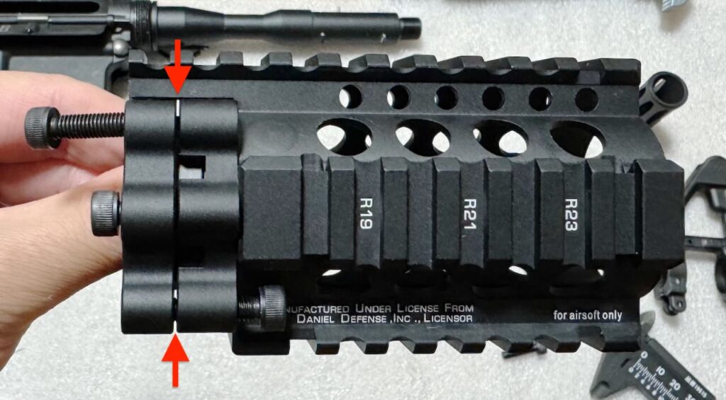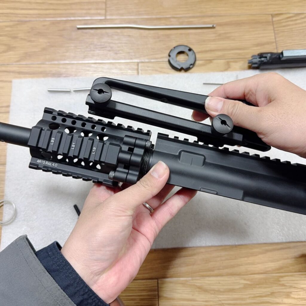 バレルナットの前後位置調整が済んだら、ハンドガードを6本のボルトで仮固定。そして「アッパーフレームとハンドガードの隙間」と「テイクダウン時の開き具合」のバランスを最終確認。納得。