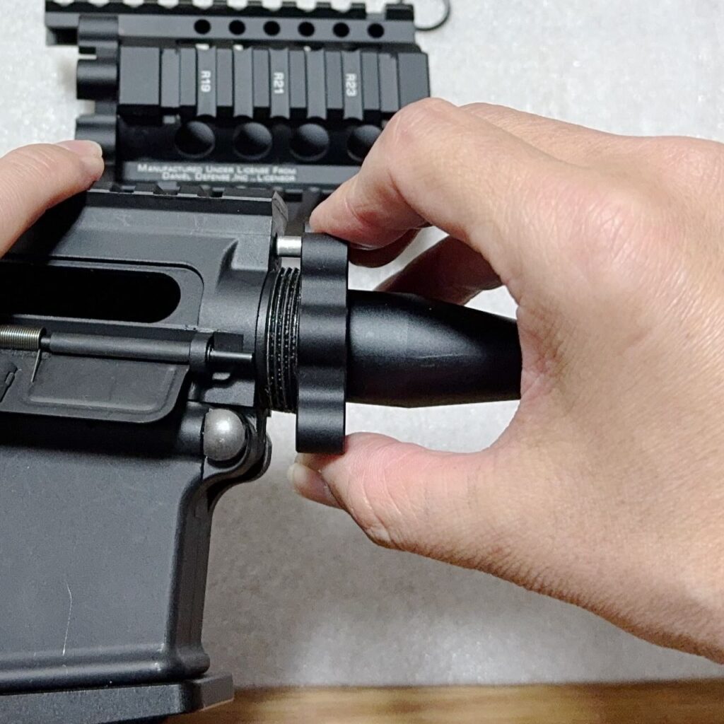 最近のハンドガードは上面以外が M-LOK か KeyMod でスルスルしてるのが流行りのようだけど、わたしは断然4面ピカティニーレールのハンドガードが好き。このゴツゴツとした見た目がたまらんですよ。その中でも6本のボルトでガッチリ固定する独特な外観のダニエルディフェンス社の RIS II はもうサイコ〜。こいつを見てるだけでご飯3杯食える。さあ、いよいよ本命中の本命、ここまでの苦労はこのためにあった。さあハンドガードを組み込むぞぉ