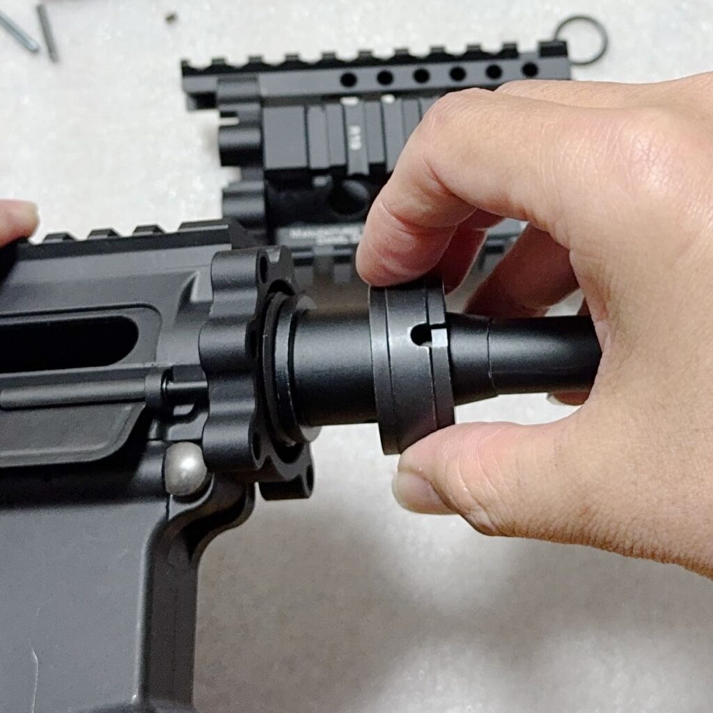 ハンドガードの適合において重要なのがアウターバレルとアッパーフレームとハンドガードの3つを結合する「バレルナット」の形状。一般的にバレルナットはハンドガードの付属品なのでハンドガードとの結合は問題ない(このハンドガードにもバレルナットが付属している)。あとはアウターバレルとアッパーフレームを結合できるかどうかが問題になる。