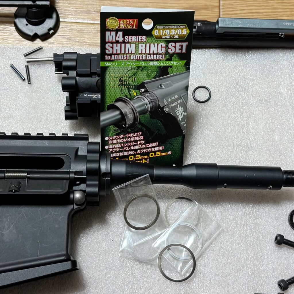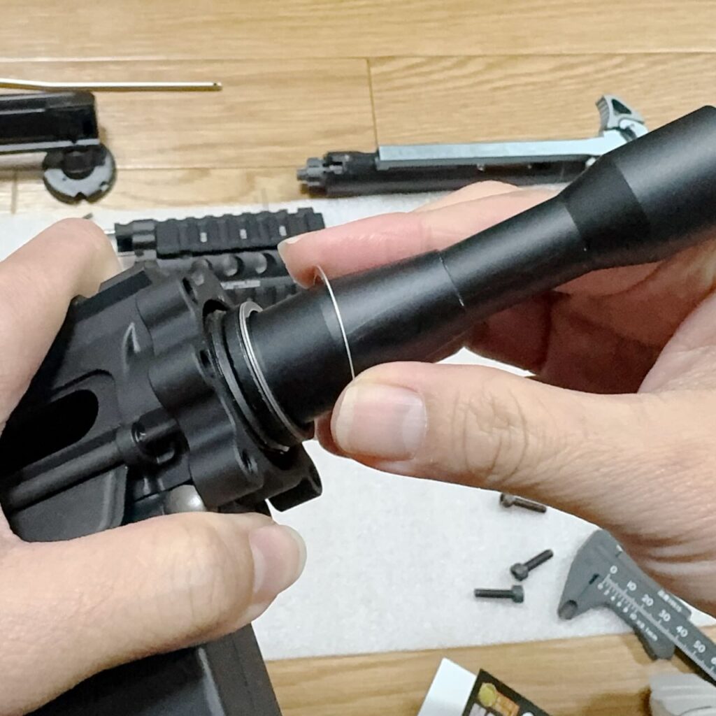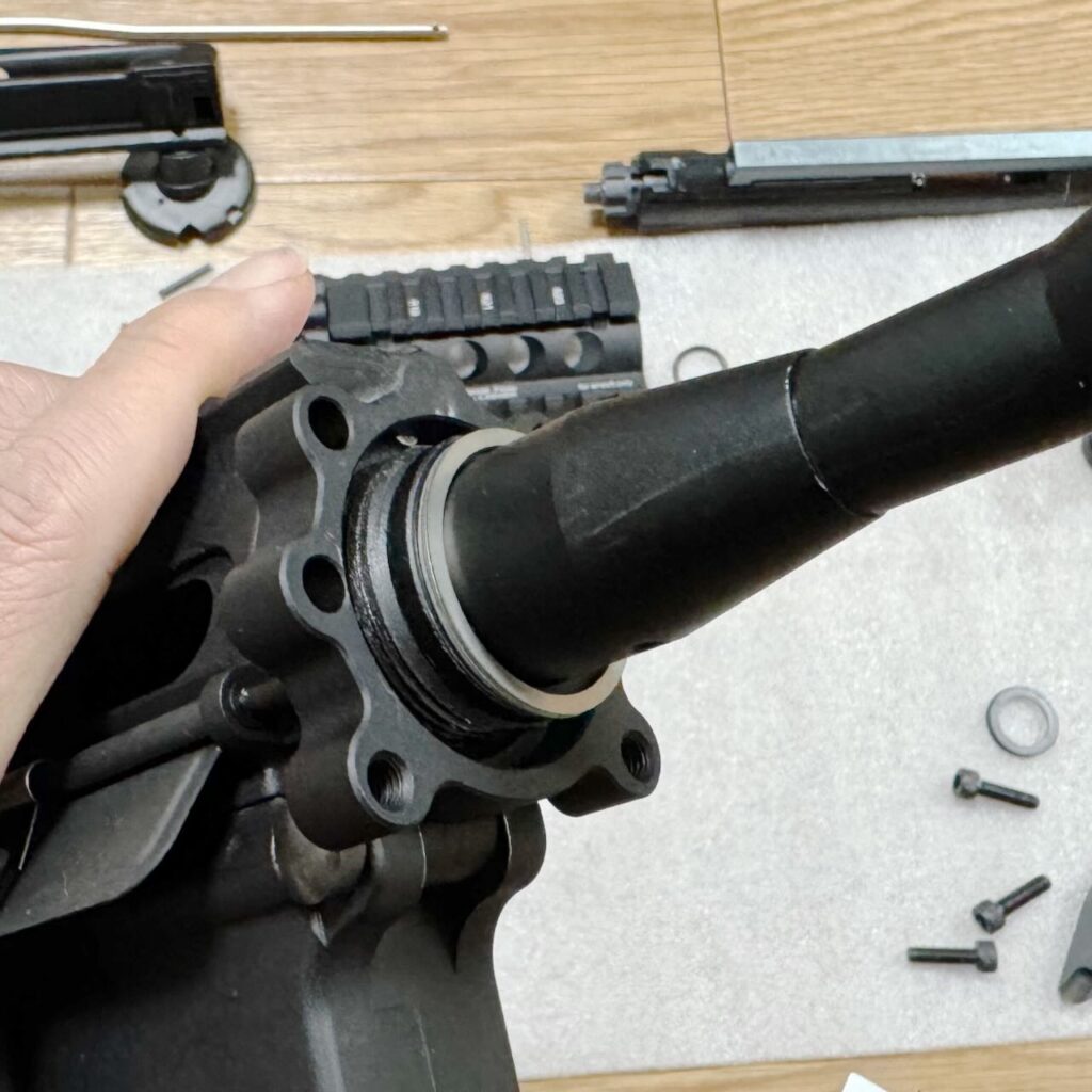 これを挟むとアウターバレル根元の円盤状の出っ張りが分厚くなるので、結果としてバレルナットの締め込み完了位置が前方へズレる。