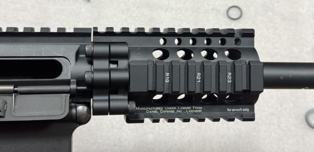 とはいえ、フレームからハンドガードにまたがるように何かを取り付けることはあまり考えられない(テイクダウンが面倒になる)から、ピカティニーレールとしての連続性はそんな気にしなくていいんだけどね。
