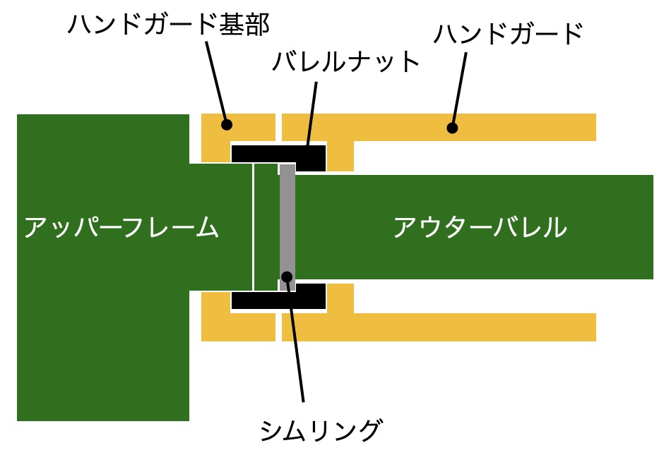 しかしバレルナットは、アウターバレルをアッパーフレームにガッチリ押さえつける役目があるのでハンドガードの前後位置調整のために勝手に締めたり緩めたりするわけにはいかない。