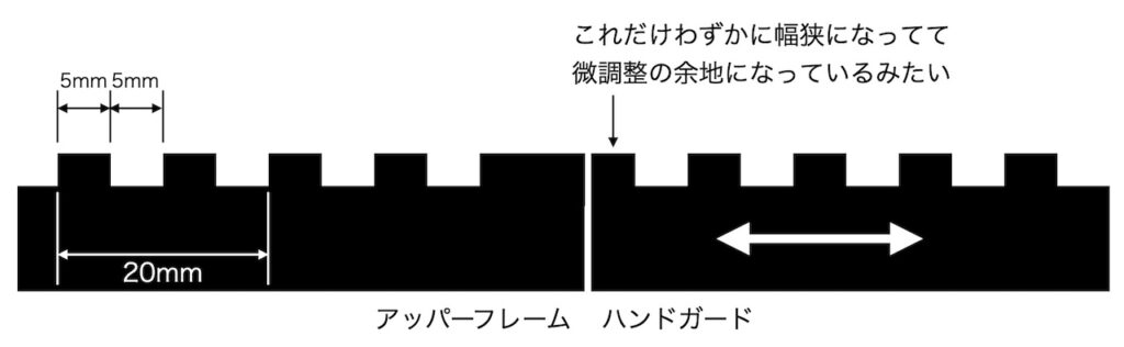 アッパーフレームのピカティニーレールとハンドガード上面のピカティニーレールがきれいに繋がるためのハンドガードの前後位置をおおまかに確認する。ピカティニーレールの凸凹はそれぞれ約5mm幅(凸が5.2mm/凹が4.8mm)になっているが、ハンドガード後端の凸だけはほんのちょっと幅が狭くなっていて前後位置の調整余地になっている。
