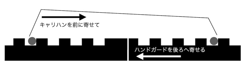 アッパーフレームとハンドガードにまたがるようにキャリングハンドルを取り付けて、キャリングハンドルを前方へ寄せる(シャフトを前側の凸に当てる)。ハンドガードをアッパーフレームへ寄せる(シャフトを前側の凸に当てる)。この状態で隙間を測るとやはり 0.5mmくらい。