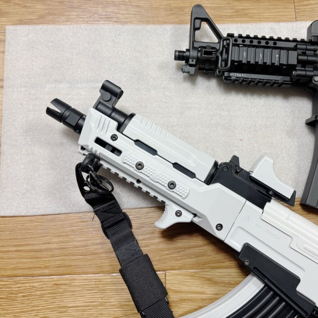 ぐる〜っと部屋の中を見渡すと、東京マルイ 次世代電動ガン AK ホワイトストームが目に入った。このハイダーいいかも。AK ホワイトストームのフラッシュハイダーと M4A1 カービンに付いていたコンペンセイターを交換。M4A1の銃口にOリングを入れて、AKから取り外した STORM用フラッシュハイダーをねじ込む。