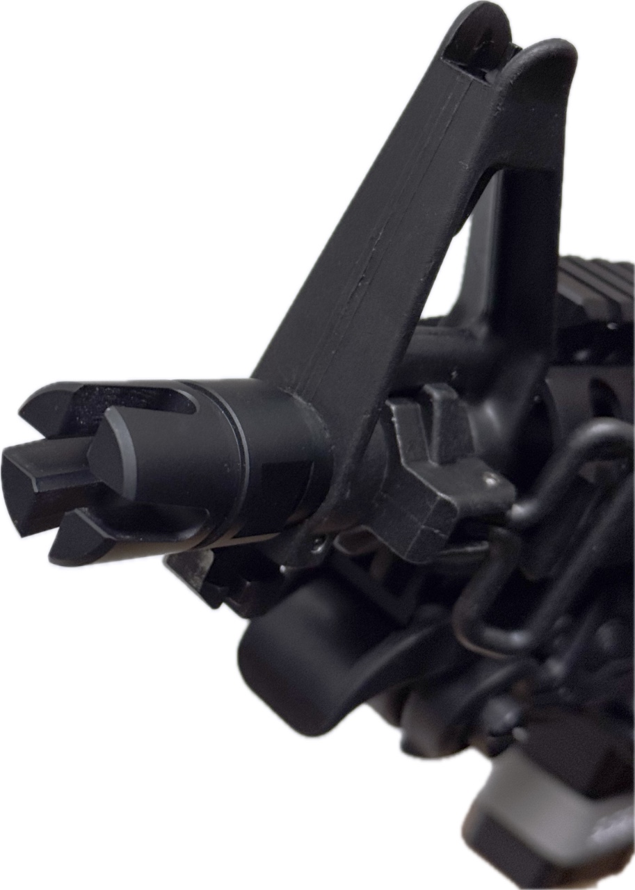 銃口部分のカスタムといえばサプレッサー。しかしサプレッサーはショートタイプといえどそれなりの長さがある。せっかく短いM4を作ろうと思ってるので、銃口にサプレッサーは付けない。となると、標準のコンペンセイターのままが無難ではあるけど、それもちょっとつまらない。