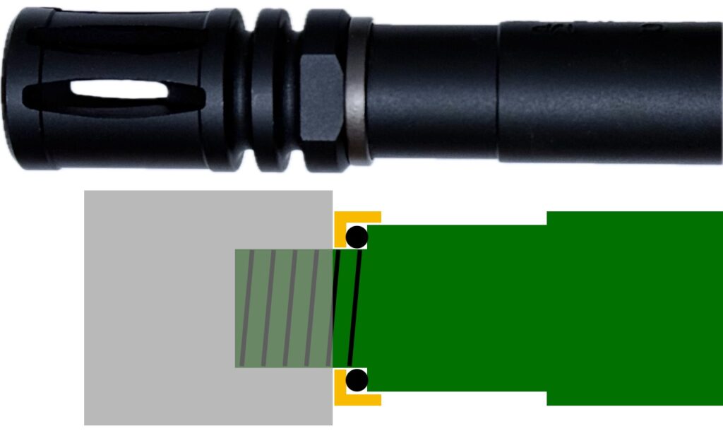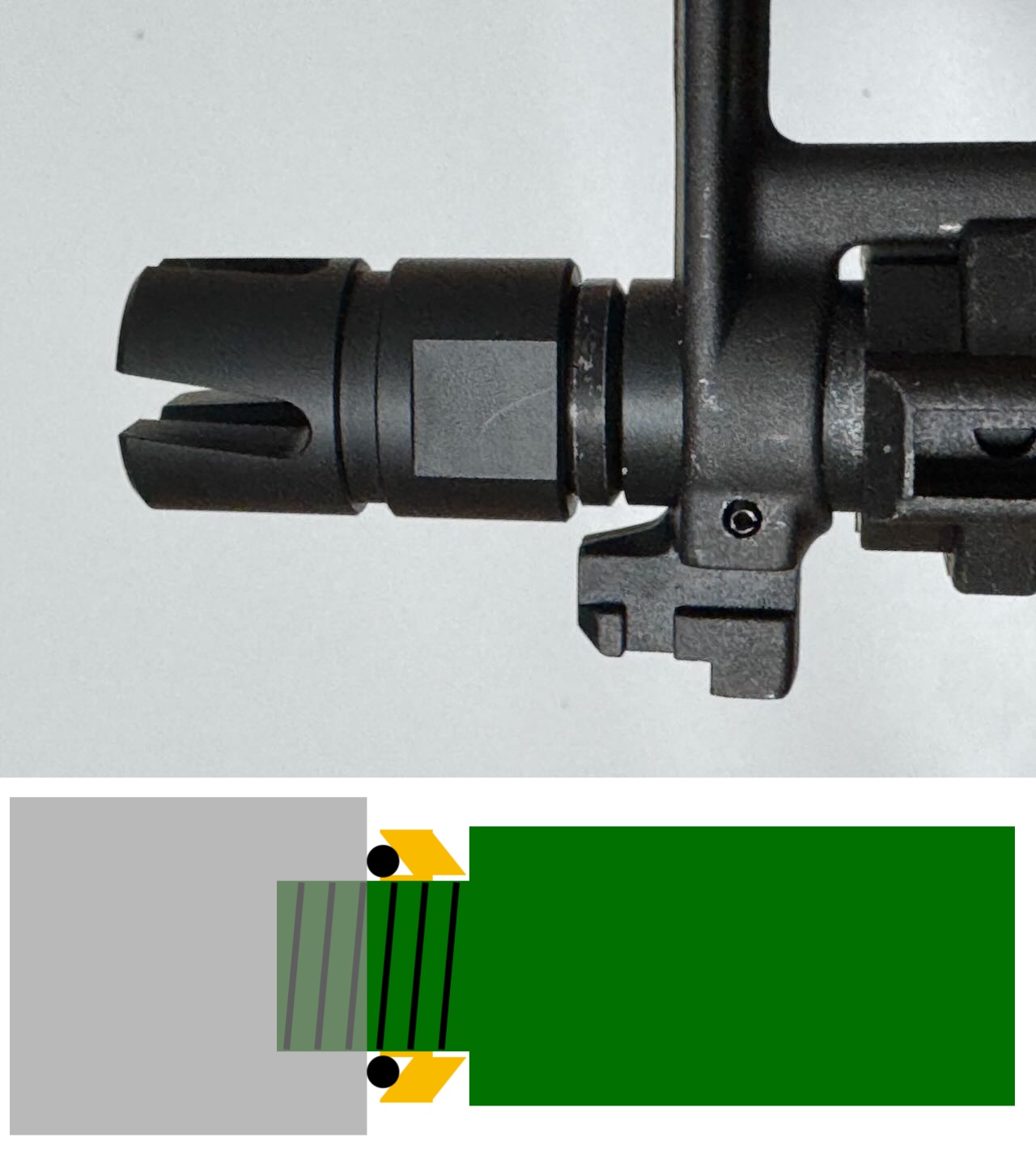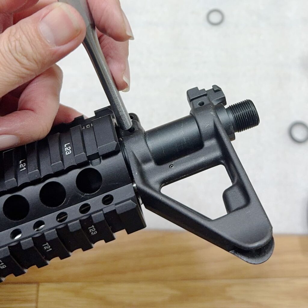 マズルとかハイダーとか呼ばれる銃口部品の多くには「向き」がある。東京マルイのM4A1 カービンでは銃口部品とバレルの間にOリングが入っていて、Oリングの弾力のおかげで銃口部品をちょうどいい向きに調整できる。またOリングの反発力でネジが押さえつけられるので緩み防止にもなっている。さらにOリングにかぶさるようにフラッシュハイダー ワッシャーがはまっている。これによってOリングが隠れてオモチャっぽさが薄れたいい感じの外観になってる。