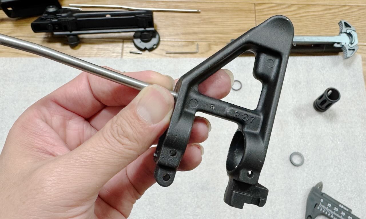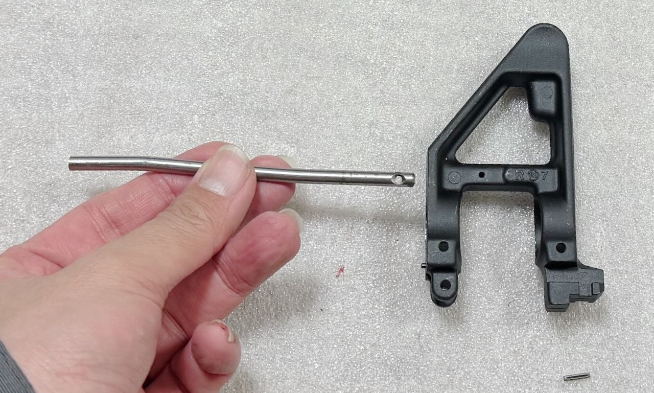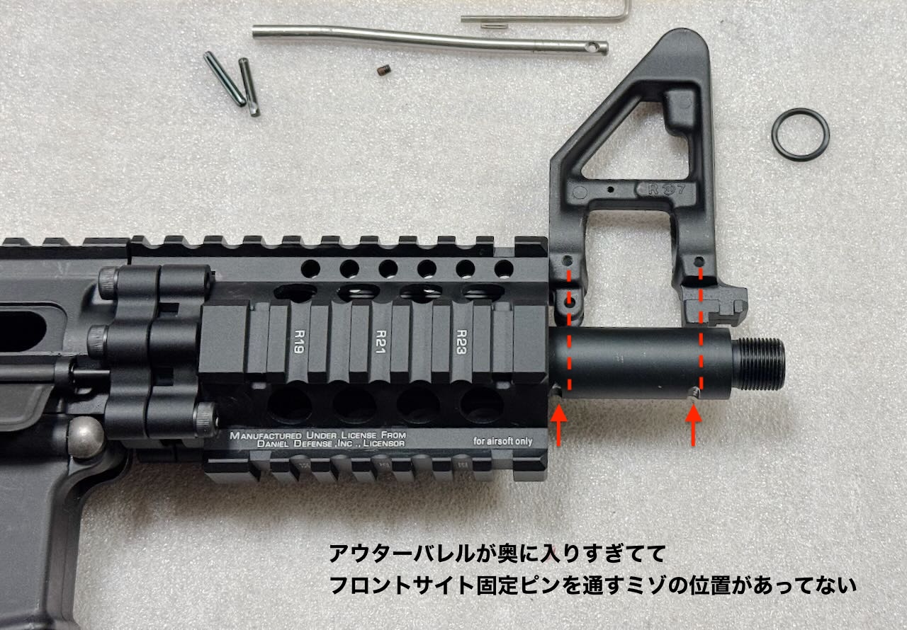 M4A1 カービンに付いていたフロントサイトを流用する。これは横から挿すピンがアウターバレルのミゾにハマることでしっかり固定される仕組み。そのつもりでアウターバレルはフロントサイト固定用のミゾが入っているものを買ってきた・・・んだが、取り付けようとアウターバレルに挿し込んでみると、アウターバレルが少し奥まっていてフロントサイトの穴とアウターバレルのミゾの位置が合わない。