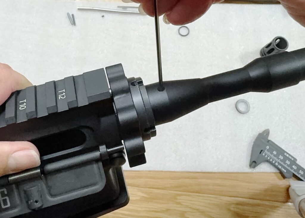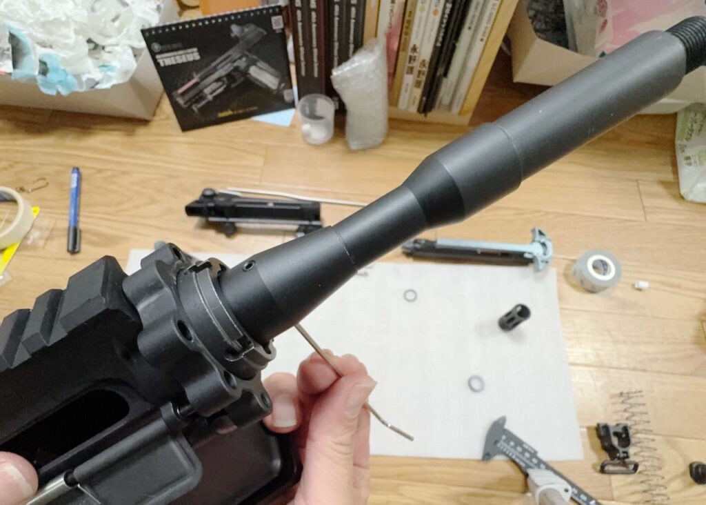 ハンドガードを外して、アウターバレル根元近くの上下にあるイモネジをゆるめると、アウターバレルを伸び縮みさせることができる。ハンドガードをかぶせてアウターバレルをちょうどいい位置まで伸ばす。インナーバレルに取り付けてあるOリングのおかげで適度な保持力があるのでスコンスコン動いてしまうことなく位置決めしやすい。位置が決まったらハンドガードを取って、アウターバレル根元のイモネジ2カ所をしっかり締めて固定。