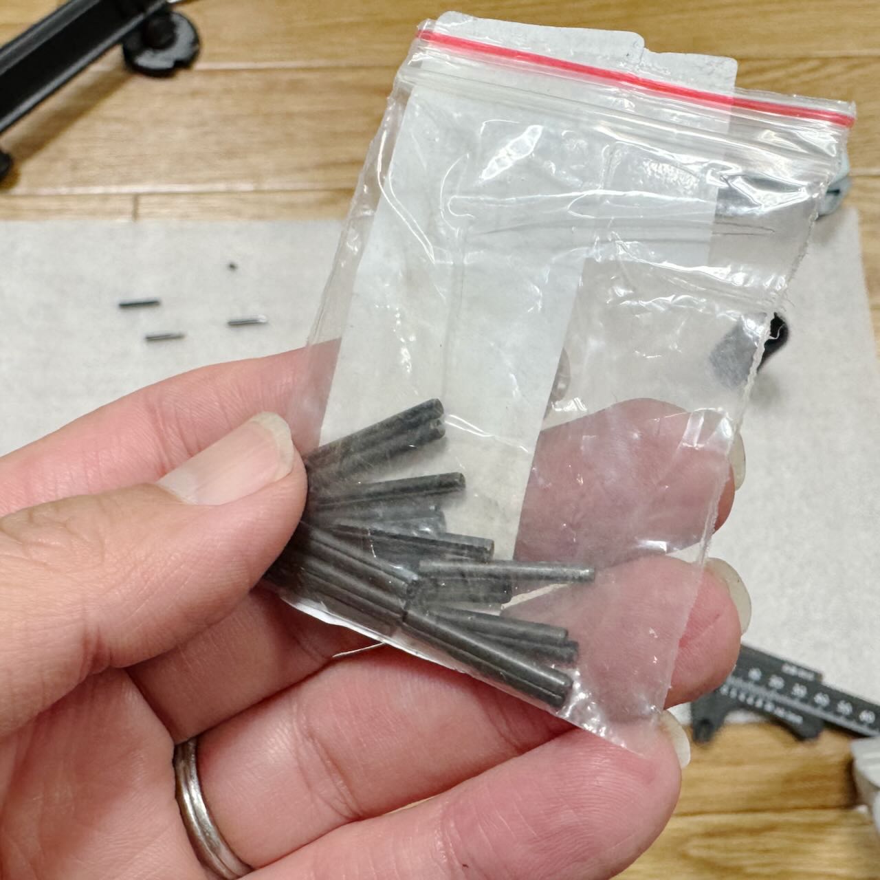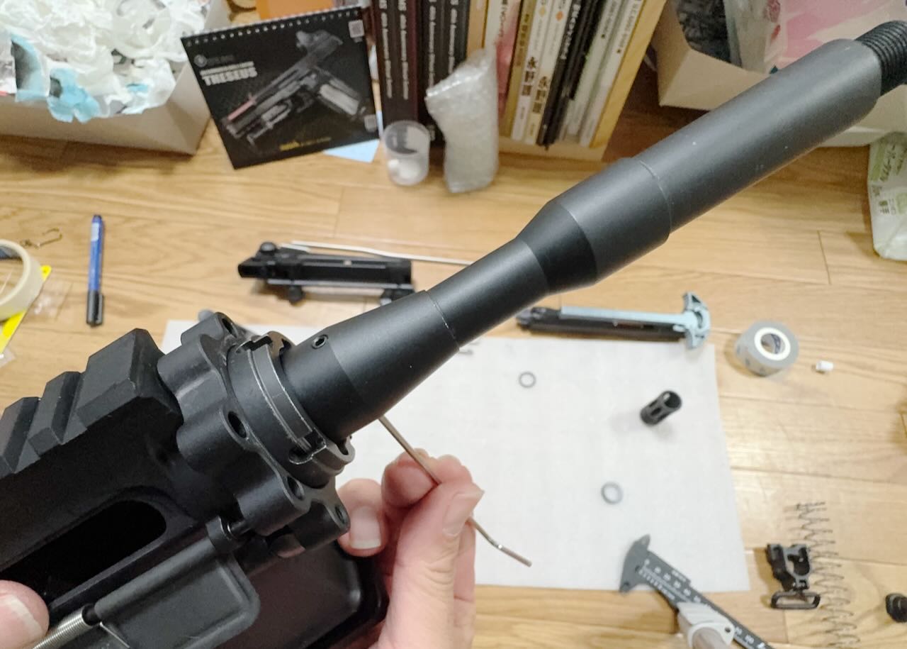 フロントサイト固定ピンを叩き込めば終わりと思ったら、またまたまた問題発覚。アウターバレルの溝が浅くて前も後ろもピンが通らない。うーん、丸棒ヤスリで溝を掘り込むか。しかしこんな細い丸棒の金ヤスリは持ってないな。ホームセンターへ行くか・・・。