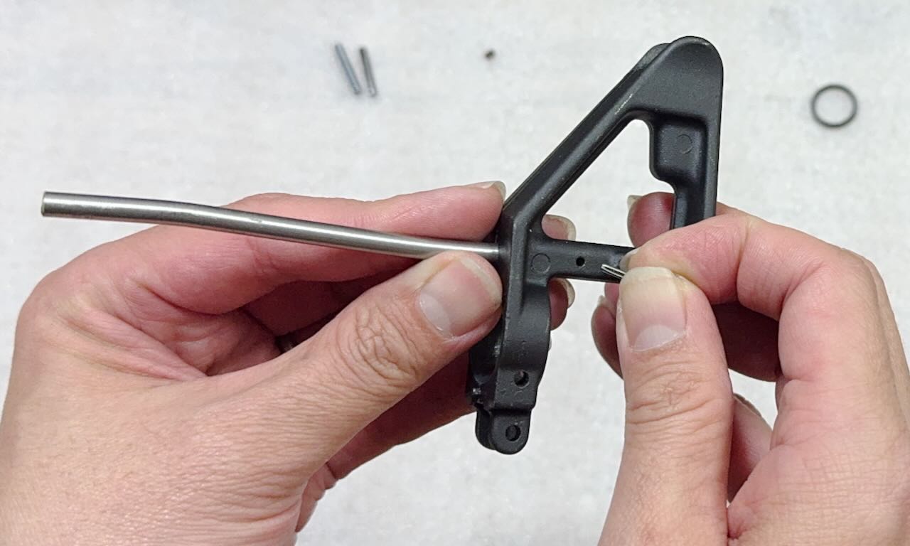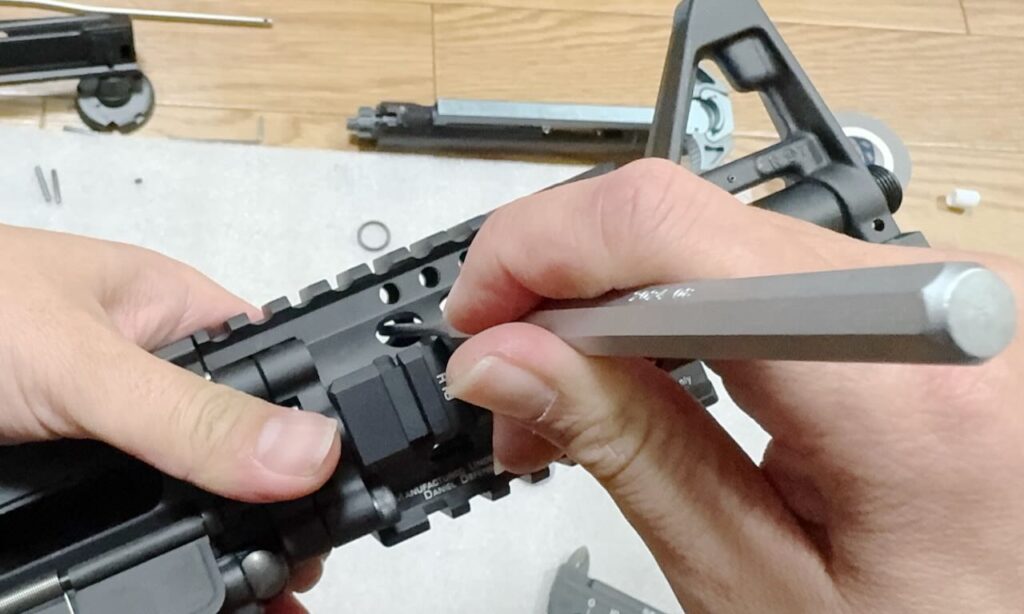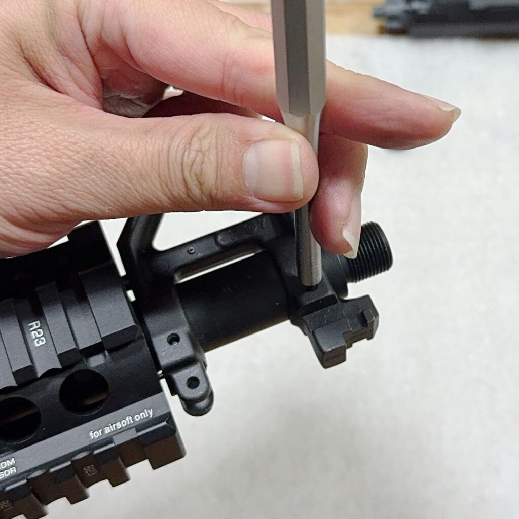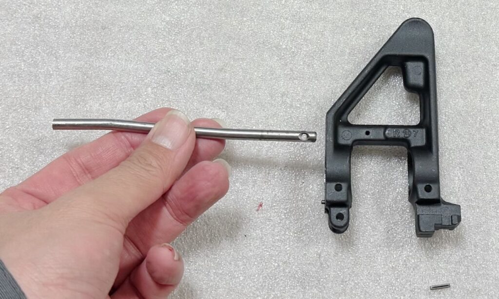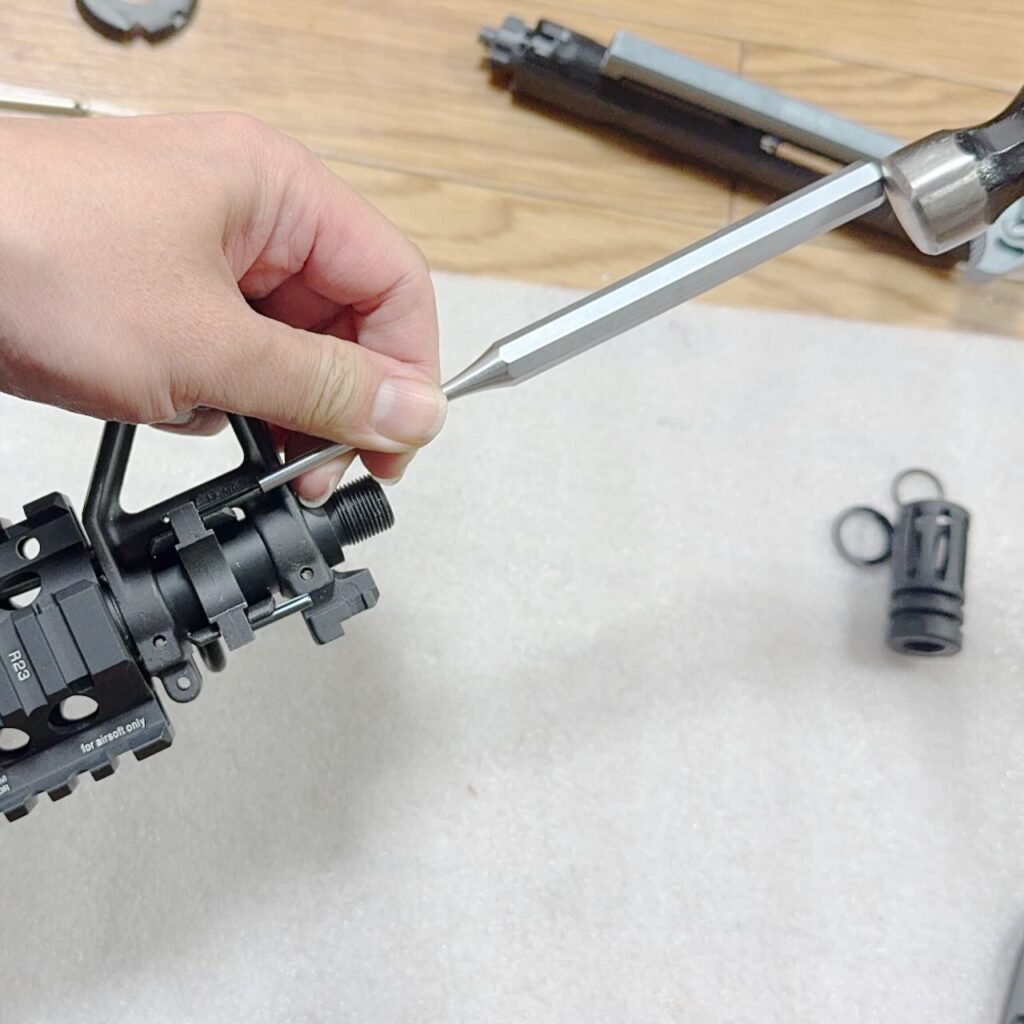 短く切ったダミーガスチューブをフロントサイトに挿し込んで、穴の位置を合わせたら、ピンを叩き込んで固定する。アウターバレルに挿し込みながらガスチューブの後端をハンドガードの奥まったところにある段差にうまいこと乗っけてフロントサイトを所定位置まで持っていく。
