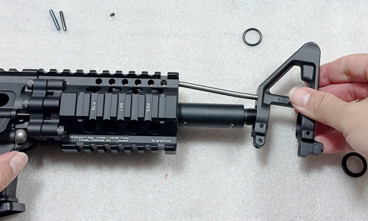 続いて M4A1 カービンに付属していたサイドスリングアダプターを戻す。フロントサイトの隙間に左側からタクティカルサイドスリングを挿して右側からスリングアダプターを挿して、上下の穴にスプリングピンを叩き込む。これは何の問題もなくすんなり完了。