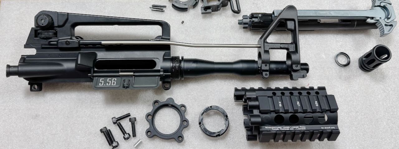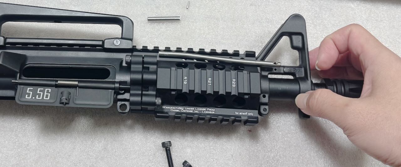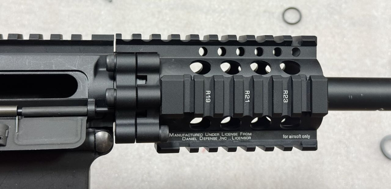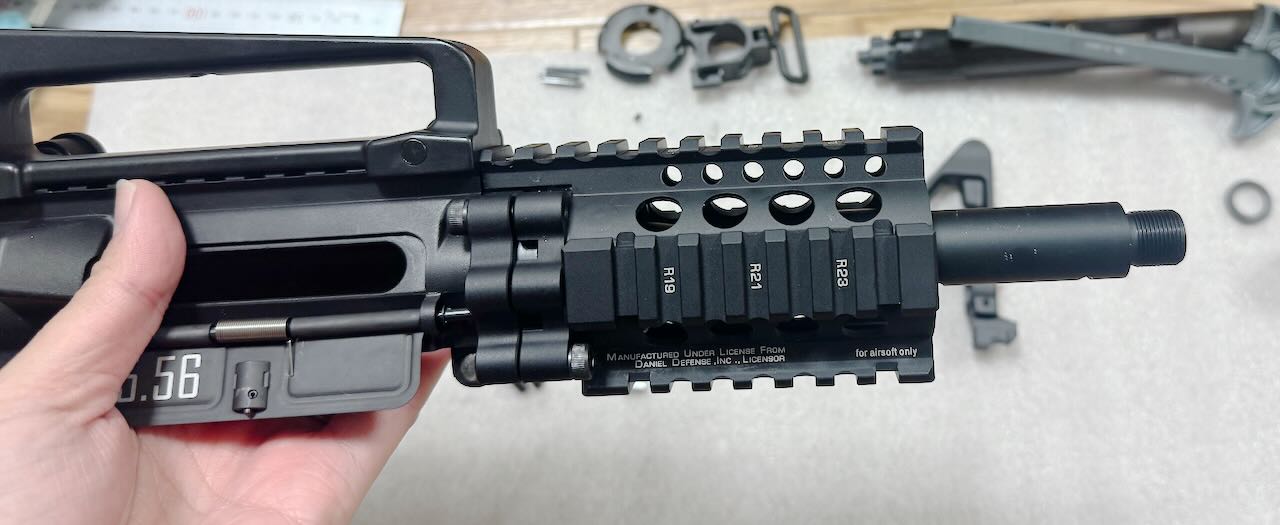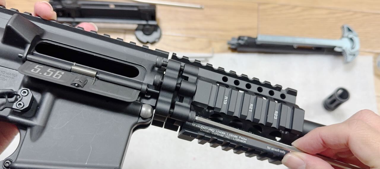 最近のハンドガードは上面以外が M-LOK か KeyMod でスルスルしてるのが流行りのようだけど、わたしは断然4面ピカティニーレールのハンドガードが好き。このゴツゴツとした見た目がたまらんですよ。その中でも6本のボルトでガッチリ固定する独特な外観のダニエルディフェンス社の RIS II はもうサイコ〜。こいつを見てるだけでご飯3杯食える。さあ、いよいよ本命中の本命、ここまでの苦労はこのためにあった。さあハンドガードを組み込むぞぉ
