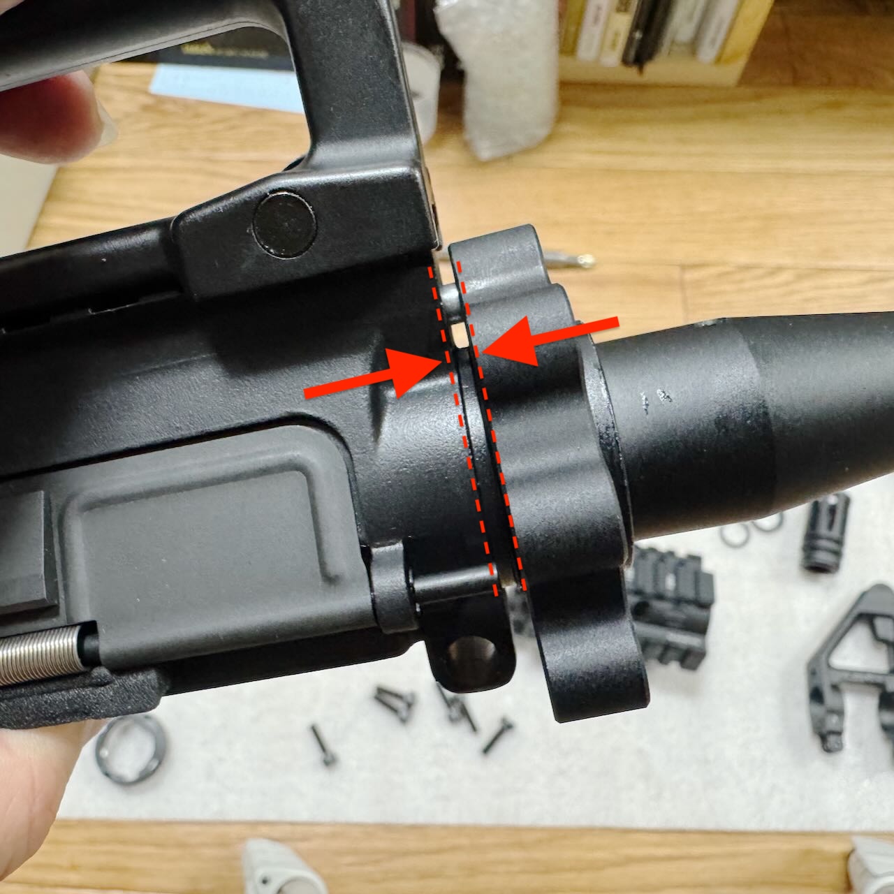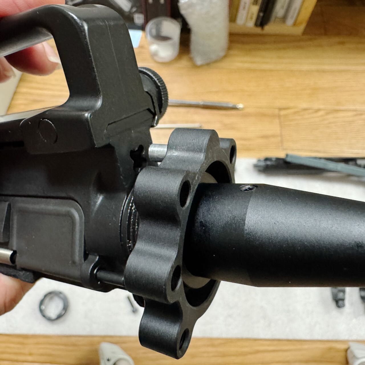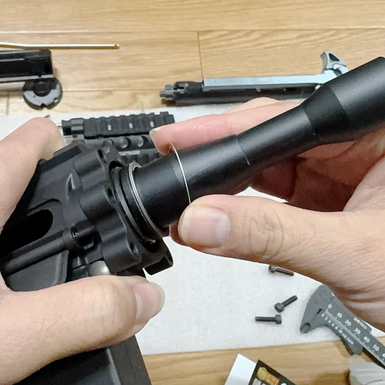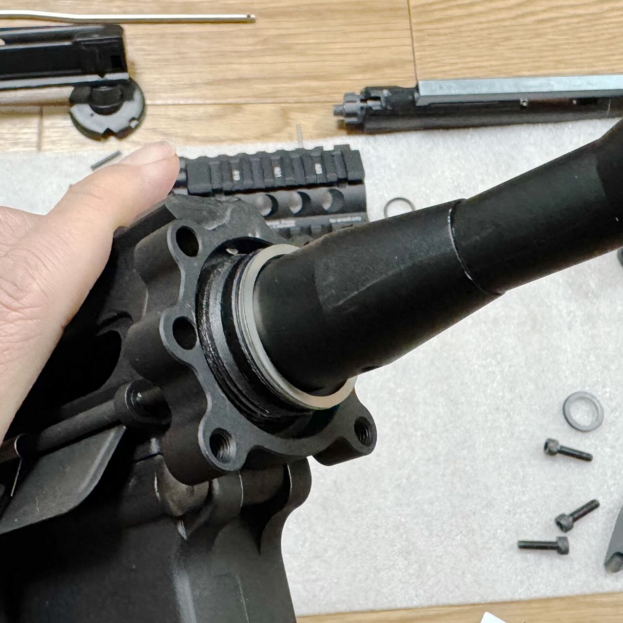 バレルナットの前後位置調整が済んだら、ハンドガードを6本のボルトで仮固定。そして「アッパーフレームとハンドガードの隙間」と「テイクダウン時の開き具合」のバランスを最終確認。納得。