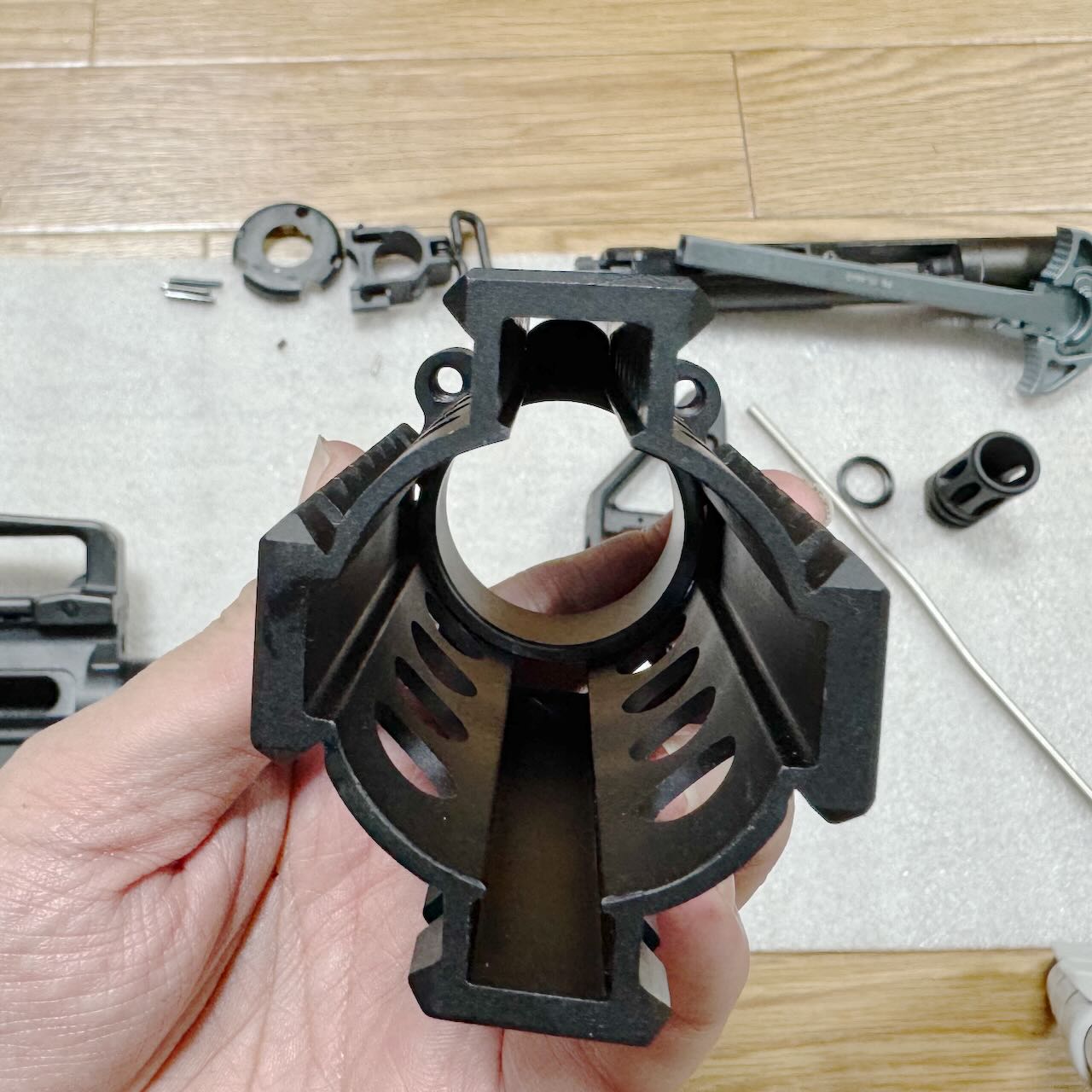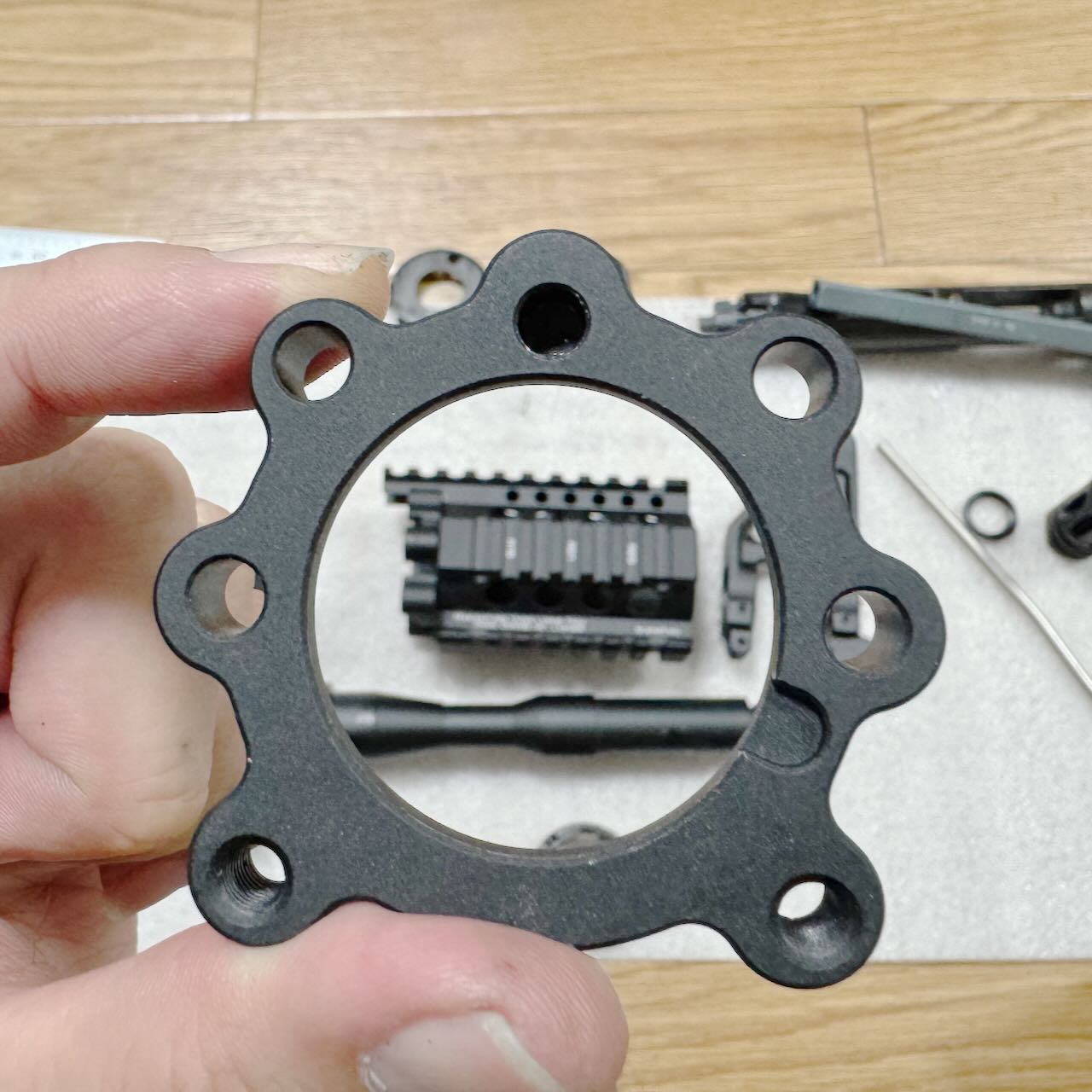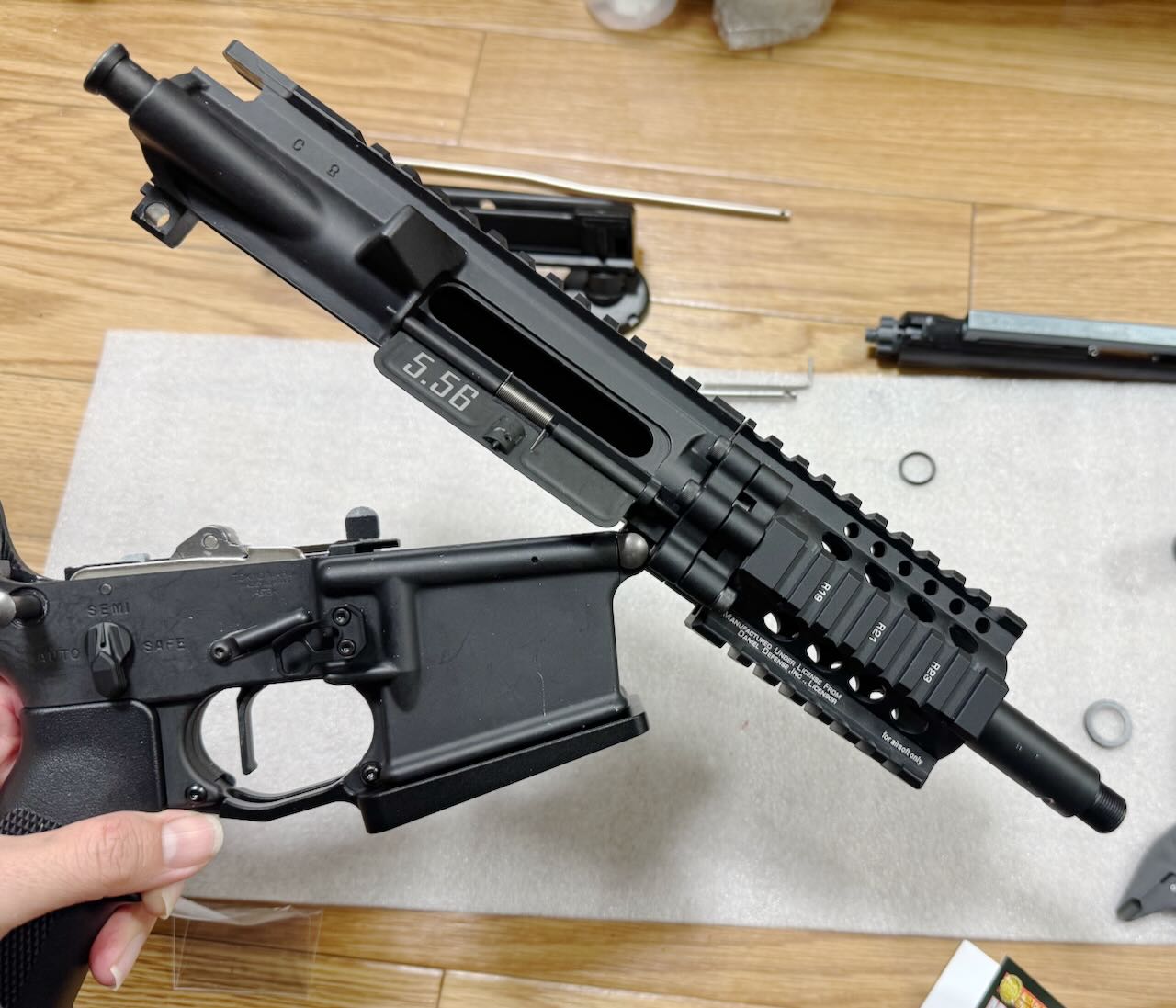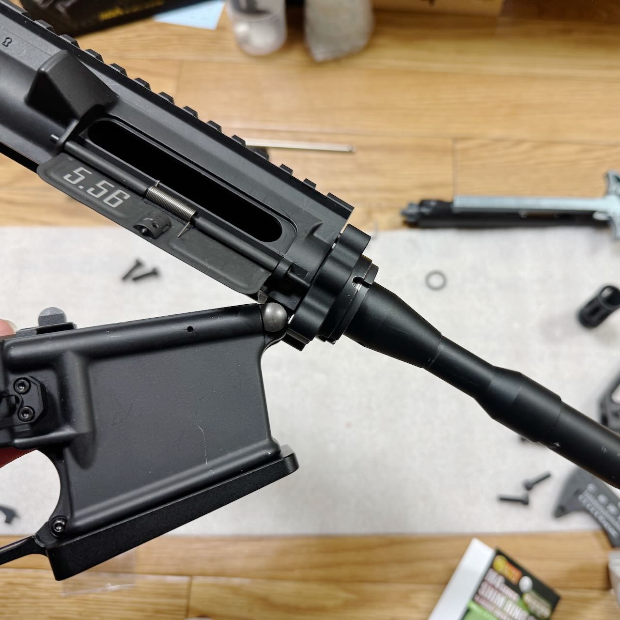 バレルナットの前後位置調整が済んだら、ハンドガードを6本のボルトで仮固定。そして「アッパーフレームとハンドガードの隙間」と「テイクダウン時の開き具合」のバランスを最終確認。納得。