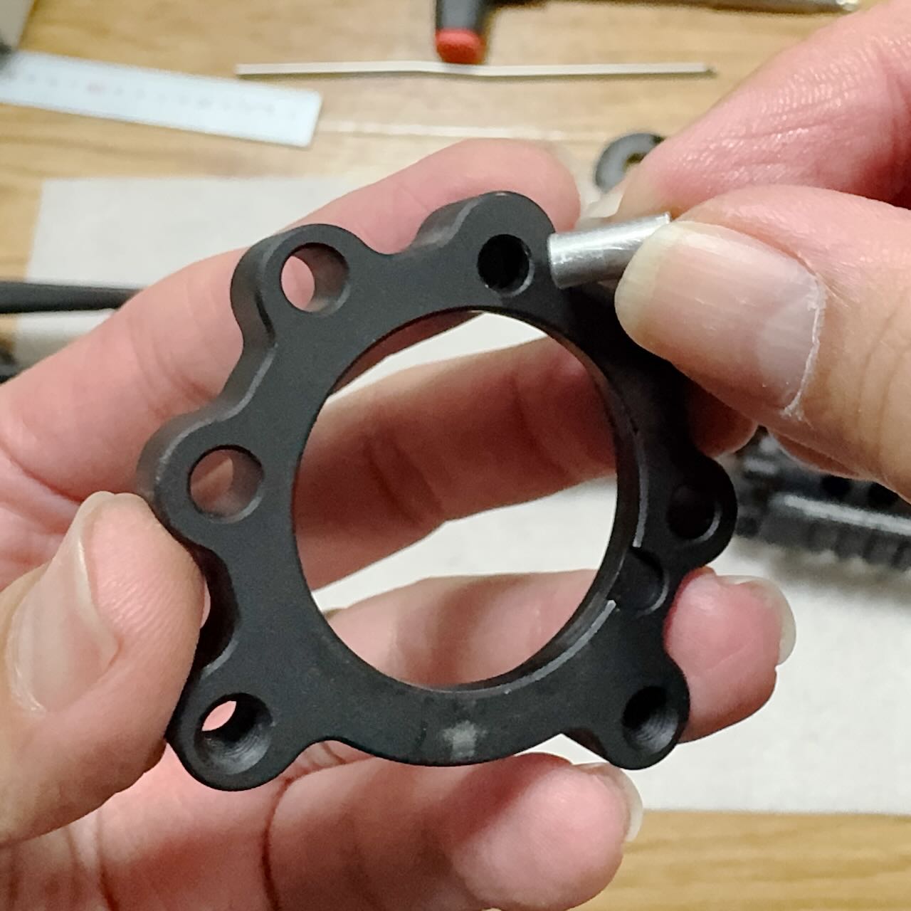 ハンドガード基部に位置合わせ用のアルミ棒を挿してバレルに通してアッパーフレームにセットする。まずはシムリングなしでバレルナットを締め込んでみる。バレルナットに空けられている穴から覗くと、この時点でバレルとの間に1mmくらいの隙間ができている。バレルナットをぎゅっと締めてもアウターバレルに届いてなくて押し付けられてない。