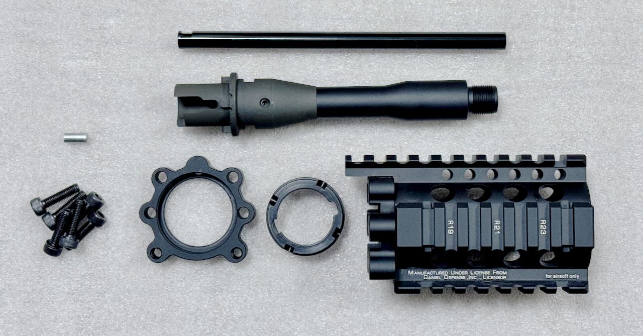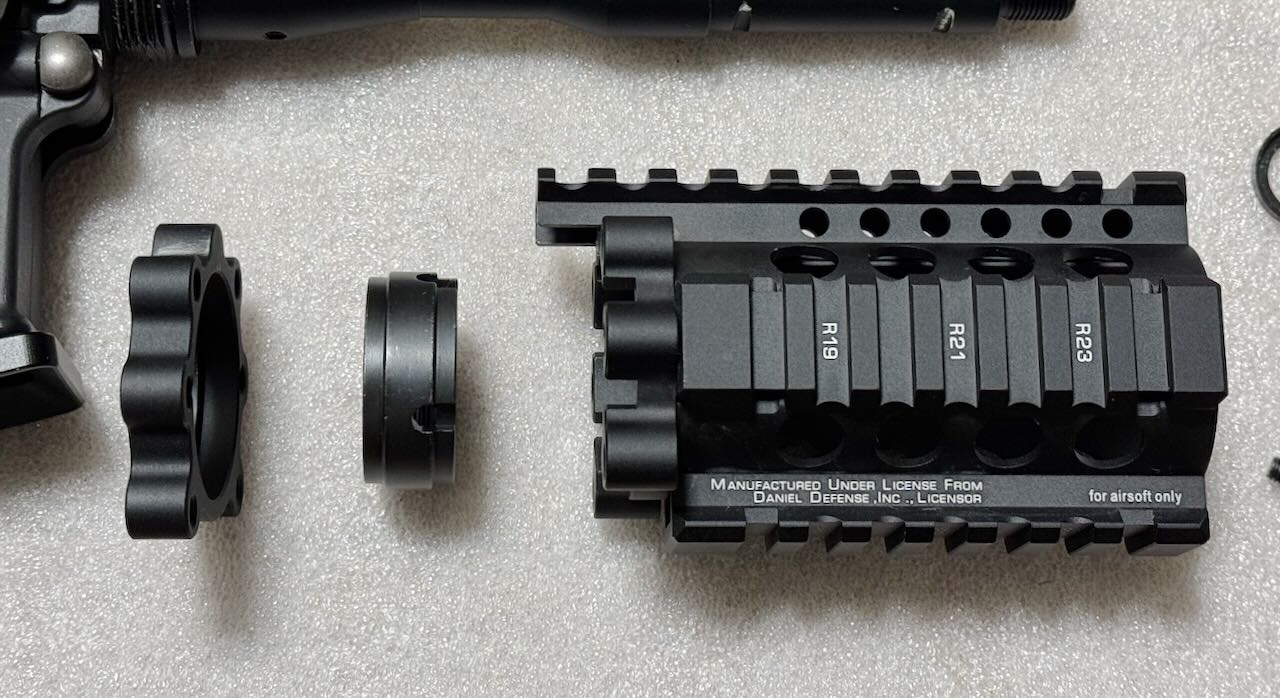 MADBULL AIRSOFT社がダニエルディフェンス社のライセンスのもとで作った4インチのショートハンドガード。このハンドガードに一目惚れして、このハンドガードを使った東京マルイのガスブロライフルが欲しくて始めたのがこのM4ショート化計画。