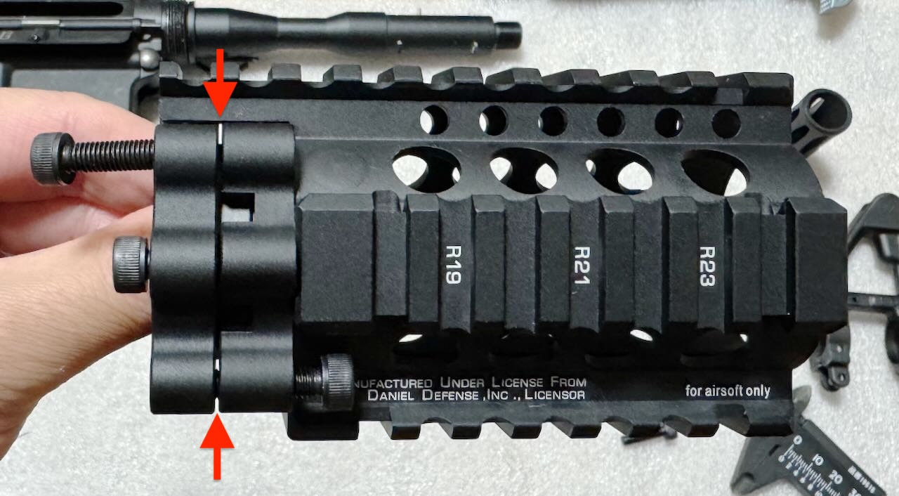 アッパーフレームのピカティニーレールとハンドガード上面のピカティニーレールがきれいに繋がるためのハンドガードの前後位置をおおまかに確認する。ピカティニーレールの凸凹はそれぞれ約5mm幅(凸が5.2mm/凹が4.8mm)になっているが、ハンドガード後端の凸だけはほんのちょっと幅が狭くなっていて前後位置の調整余地になっている。