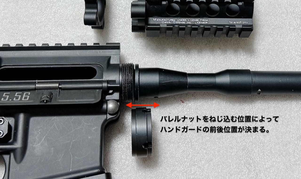 しかしバレルナットは、アウターバレルをアッパーフレームにガッチリ押さえつける役目があるのでハンドガードの前後位置調整のために勝手に締めたり緩めたりするわけにはいかない。