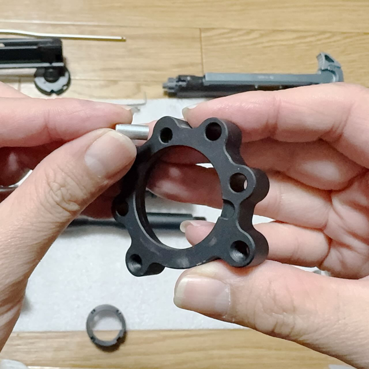 これを挟むとアウターバレル根元の円盤状の出っ張りが分厚くなるので、結果としてバレルナットの締め込み完了位置が前方へズレる。
