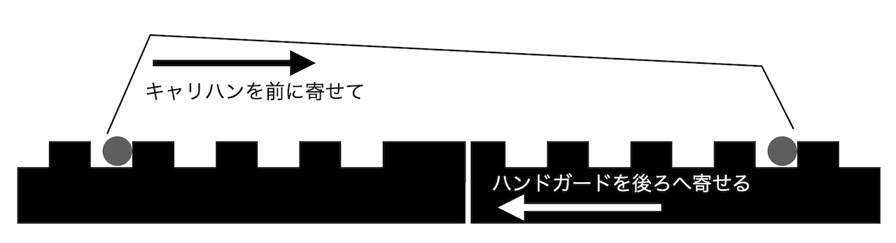 アッパーフレームとハンドガードにまたがるようにキャリングハンドルを取り付けて、キャリングハンドルを前方へ寄せる(シャフトを前側の凸に当てる)。ハンドガードをアッパーフレームへ寄せる(シャフトを前側の凸に当てる)。この状態で隙間を測るとやはり 0.5mmくらい。