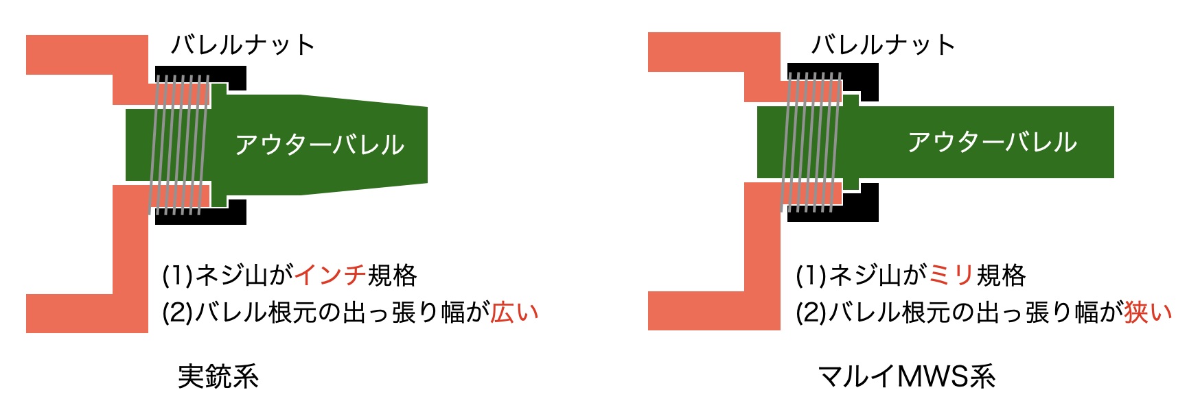 • 【バレル根元の円盤状の出っ張り】東京マルイMWS系は狭く、東京マルイ電ガンやその他実銃系は広い。つまり、東京マルイMWS純正のアウターバレルを使うならバレルがすっぽ抜けないようにバレルナットの穴を狭くするバレルガイドとかバレルナットアダプターとか呼ばれるリング状部品が別途必要、実銃系の出っ張りが大きなアウターバレルを使うなら不要。