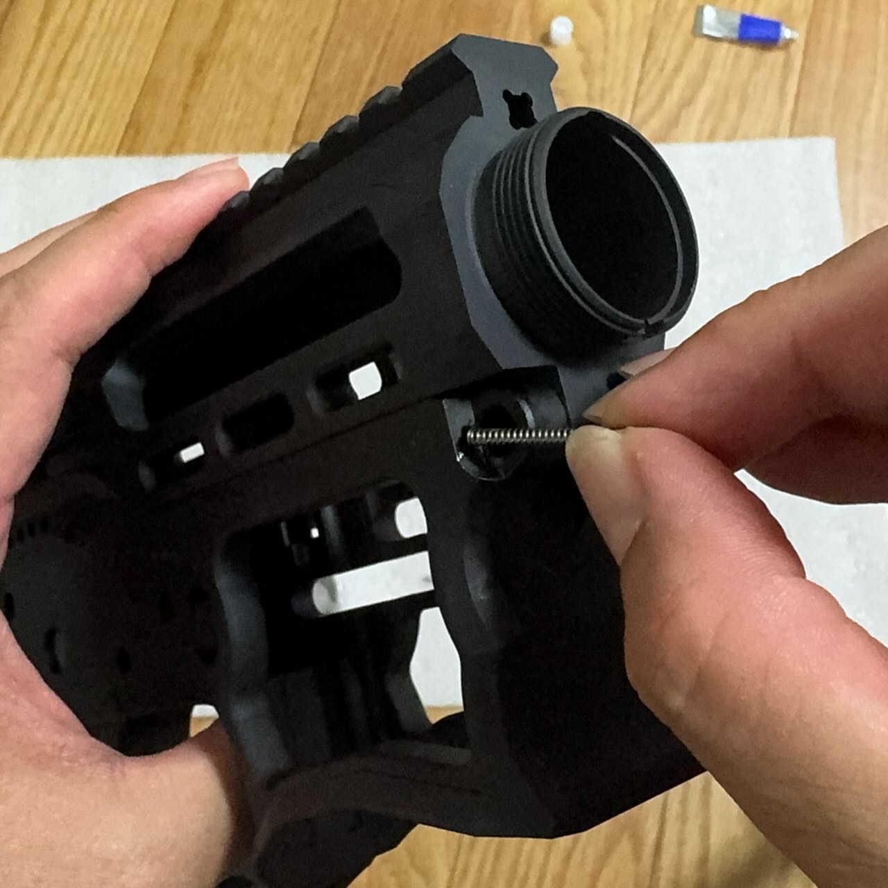 キャッスルナットとエンドプレートをセットし終わったら、バッファーチューブをロアレシーバーにクリクリとねじ入れる。バッファーチューブの先端は下側になる部分がほんのちょっと出っ張っている。この出っ張りがバッファーストッパーの端っこにちょっとかぶさることで押さえになる。この位置までバッファーチューブをねじ込んだら、エンドプレートを前方へ移動させつつスプリングをエンドプレートの小さな丸い凹みにはめてロアレシーバーにピッタリくっつける。エンドプレートを押さえながらキャッスルナットをクルクルっと前方へ進めてしっかり締める。