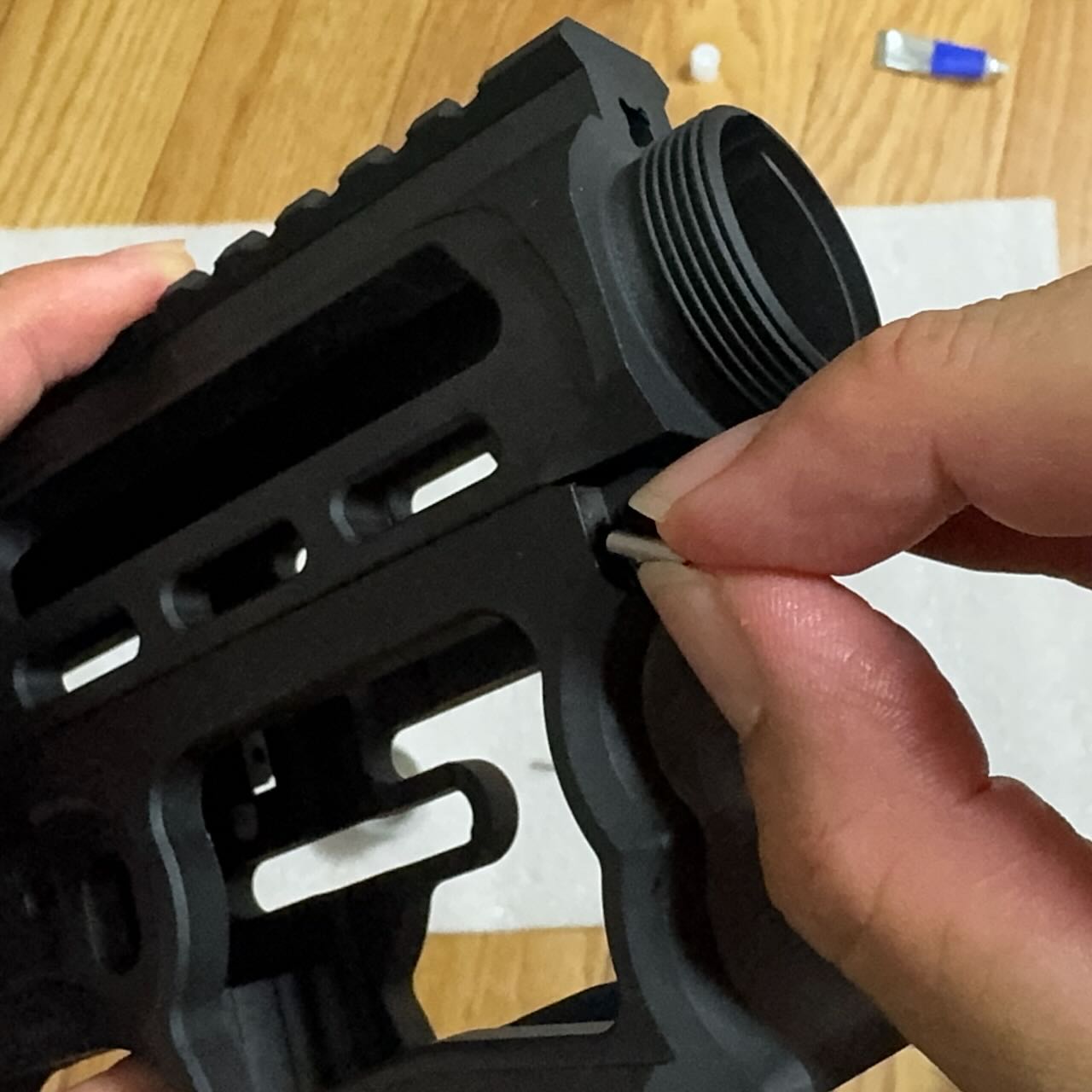 このレシーバーはMWS互換なので最も簡単なのは適当な東京マルイMWS系ガスブロライフルを用意して、レシーバー部分をこれに取り換えればいい、と思いきやこいつはハンドガードとバッファーチューブを取り付けるネジ部分が実銃と同じ「インチ規格」になってる。東京マルイは「ミリ規格」なので、東京マルイのMWS系ガスブロをベースにするにしてもインチ規格のハンドガードとバッファーチューブも別途用意しないといかん。レシーバー、ハンドガード、バッファーチューブを新調するとなると・・・