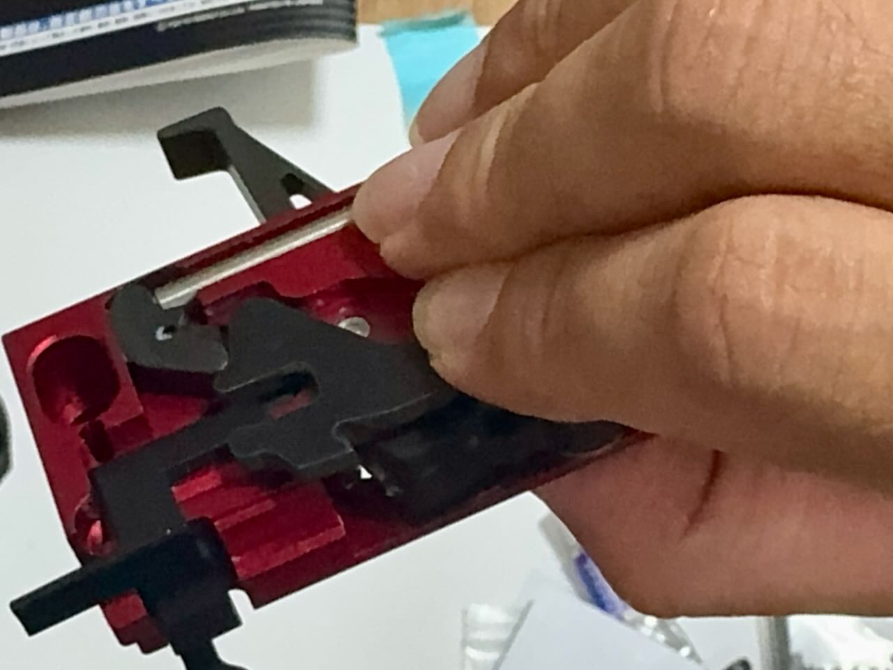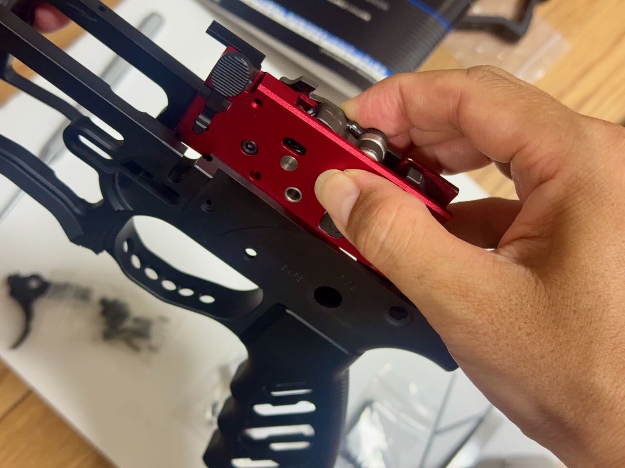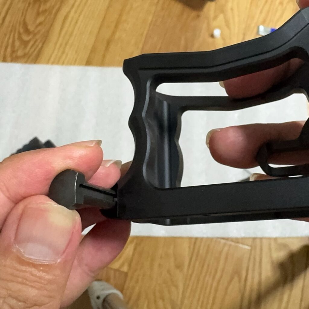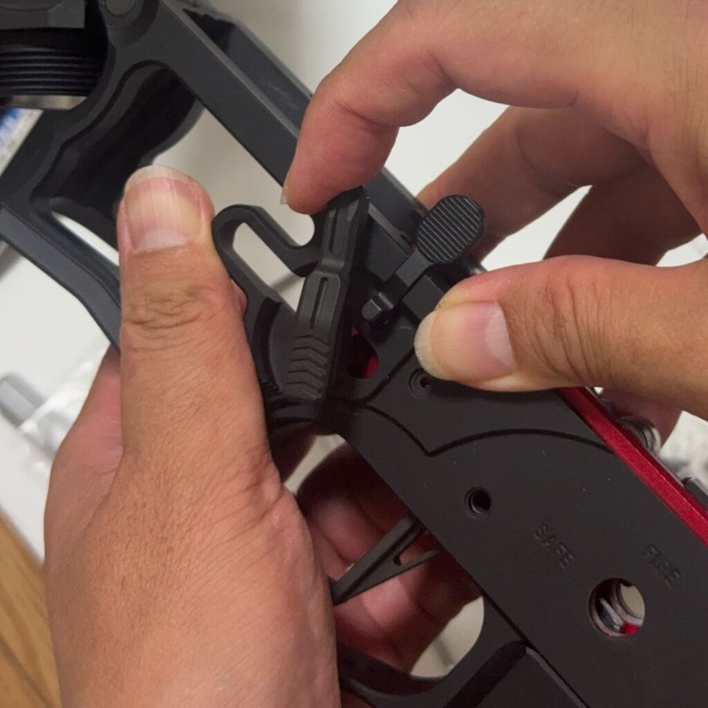 東京マルイ純正のレシーバーとトリガーユニットはサイズがピッチピチで、入れるのも出すのもハンマーでガンガン叩いて一苦労なんだけど、今回の組み合わせはキツすぎずゆるすぎずちょうどいい塩梅でハマった。トリガーユニット付属のネジでロアレシーバーに仮止め。手でハンマーを下げてシアーを下げて、トリガーを引いてパチンっとハンマーが上がることを何度か確認。順調、順調。