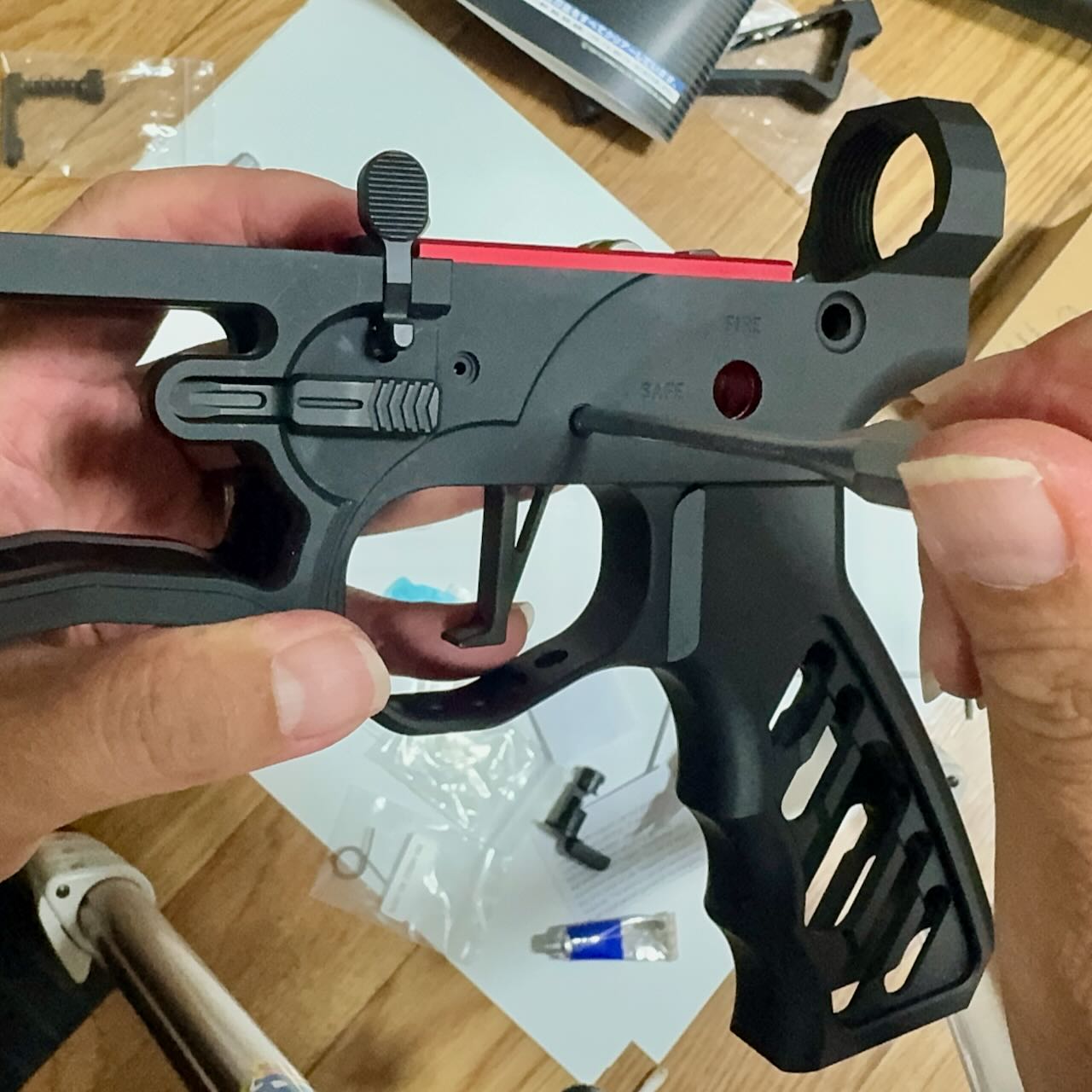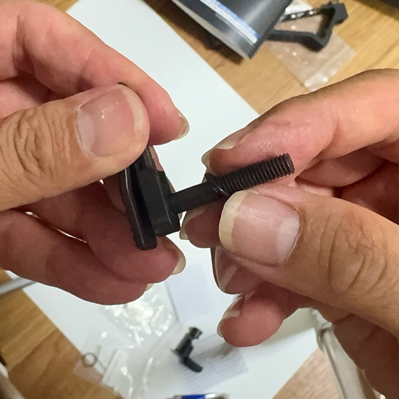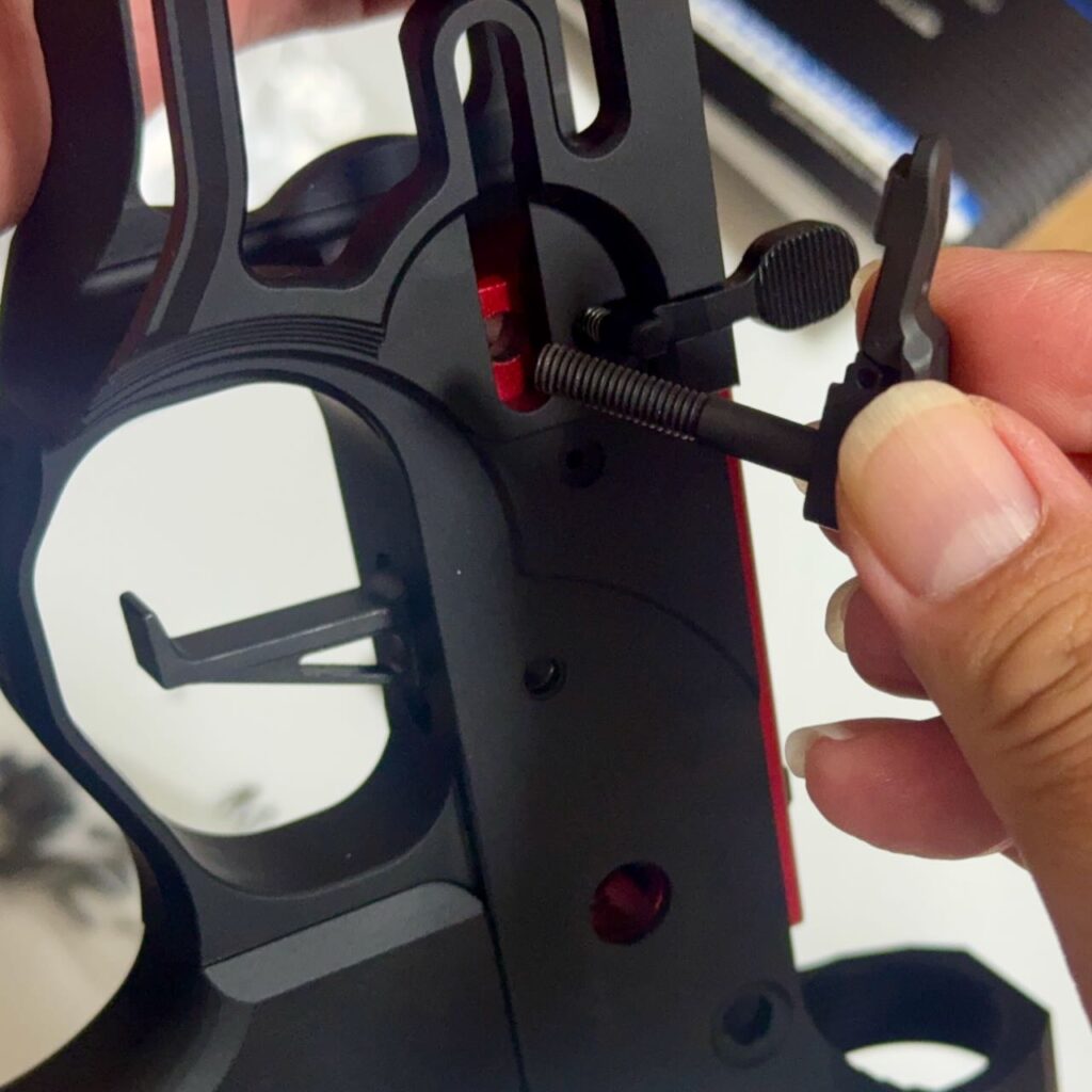 東京マルイ純正のレシーバーとトリガーユニットはサイズがピッチピチで、入れるのも出すのもハンマーでガンガン叩いて一苦労なんだけど、今回の組み合わせはキツすぎずゆるすぎずちょうどいい塩梅でハマった。トリガーユニット付属のネジでロアレシーバーに仮止め。手でハンマーを下げてシアーを下げて、トリガーを引いてパチンっとハンマーが上がることを何度か確認。順調、順調。
