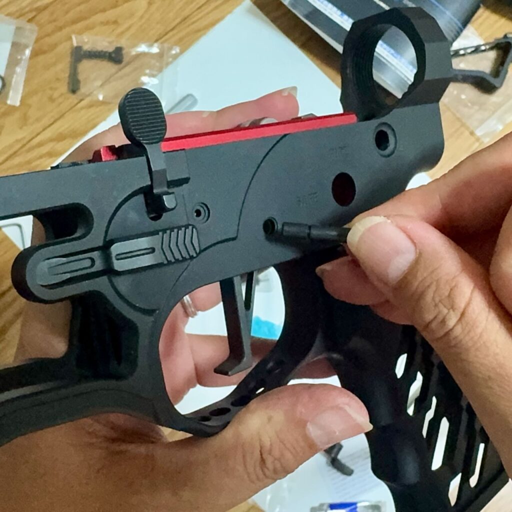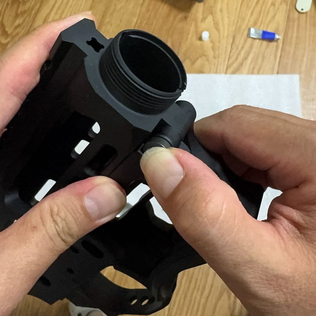 ロアレシーバー右側の穴に前方からバネとロックピンを入れて、ロックピンを細い棒で押しこみながら横からピボットピンの溝にロックピンがハマるように向きを合わせてピボットピンを挿し込む。