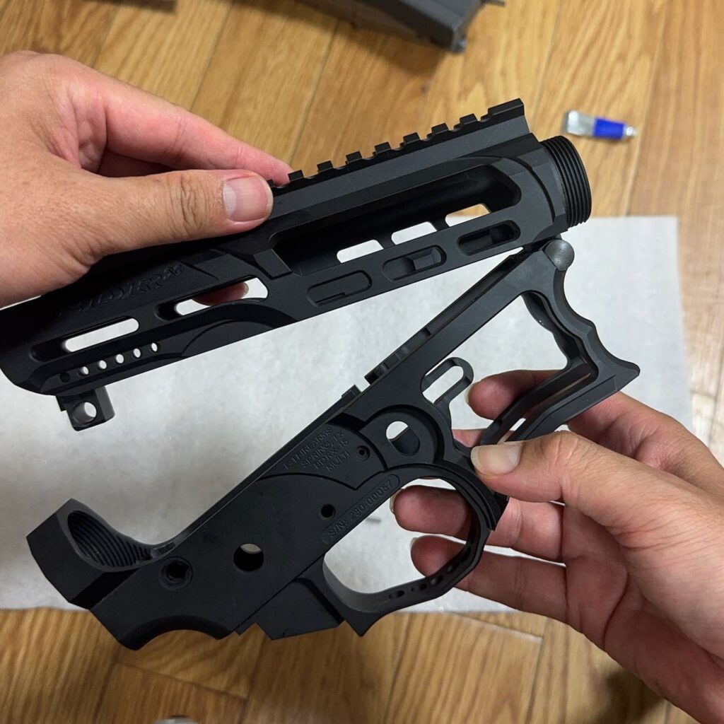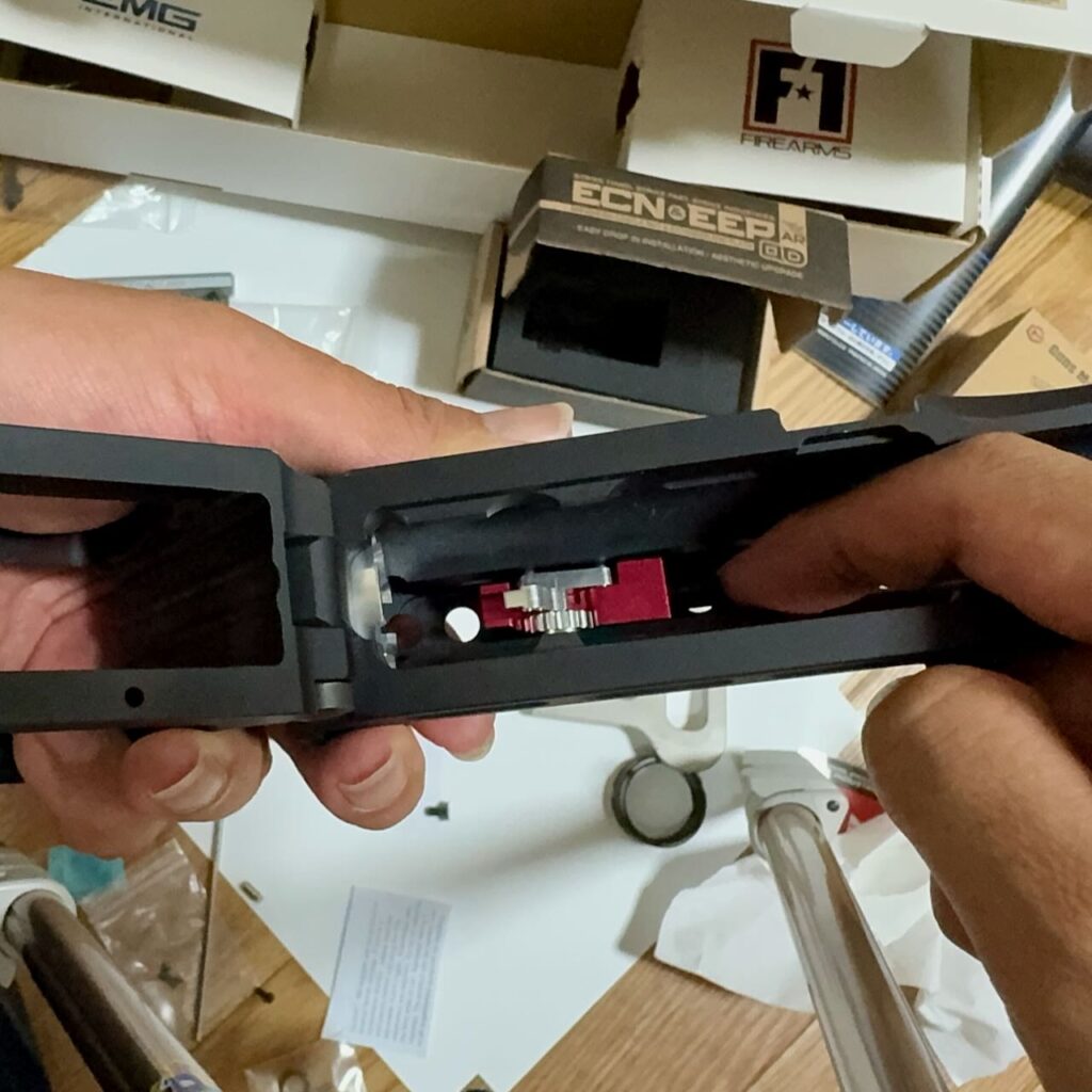 ロアレシーバーとアッパーレシーバーがパカパカできることを確認する。噛み合わせが悪くてレシーバーの合わせ目を削ってすり合わせが必要なキットもあるけど、これは無調整できれいにパカパカできた。出足好調。