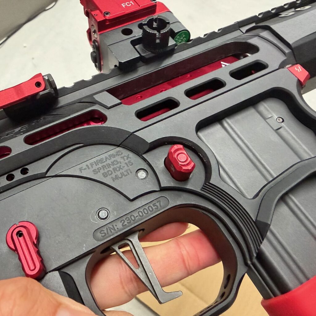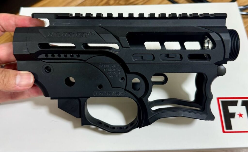ネットで調べたら F-1 Firearms 社の民間向けライフルをモデルにしたレシーバーとのこと。へぇ実銃としても存在してるのか、これ。マガジンハウジングとアッパーレシーバーの大胆な肉抜き、フォワードアシストノブの省略、こういう変なの、好きなんだよなぁ。好き、好き、大好き。