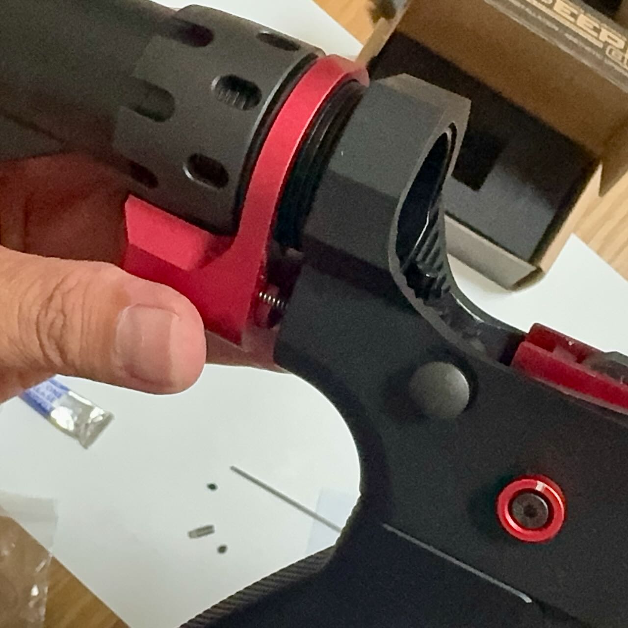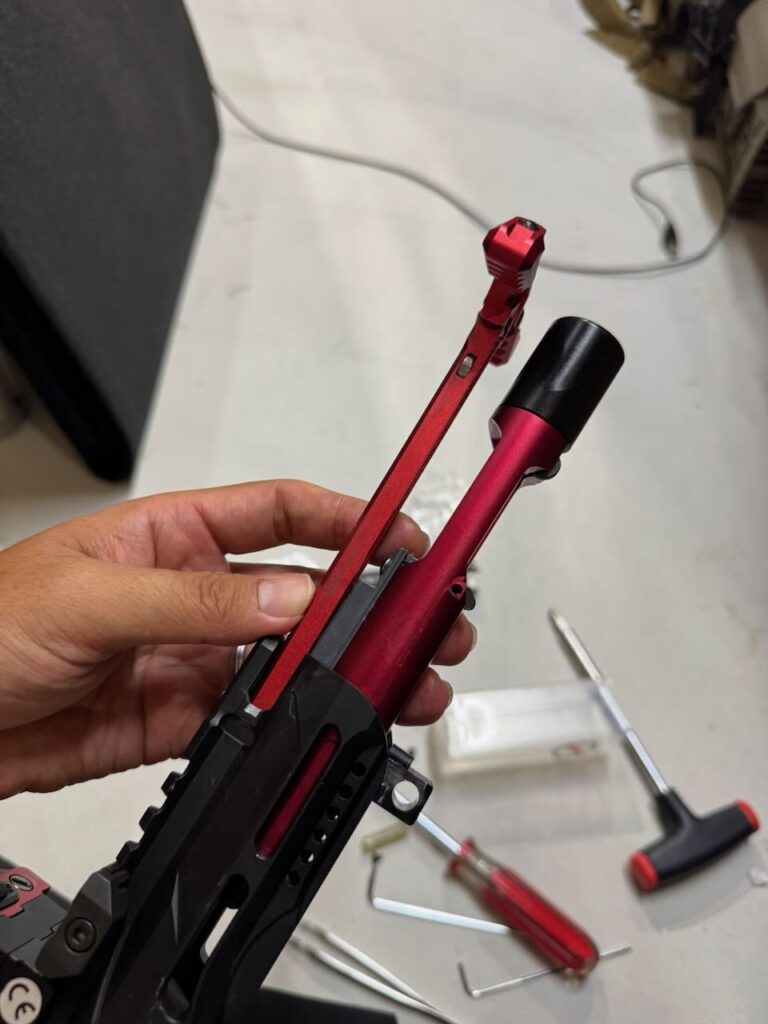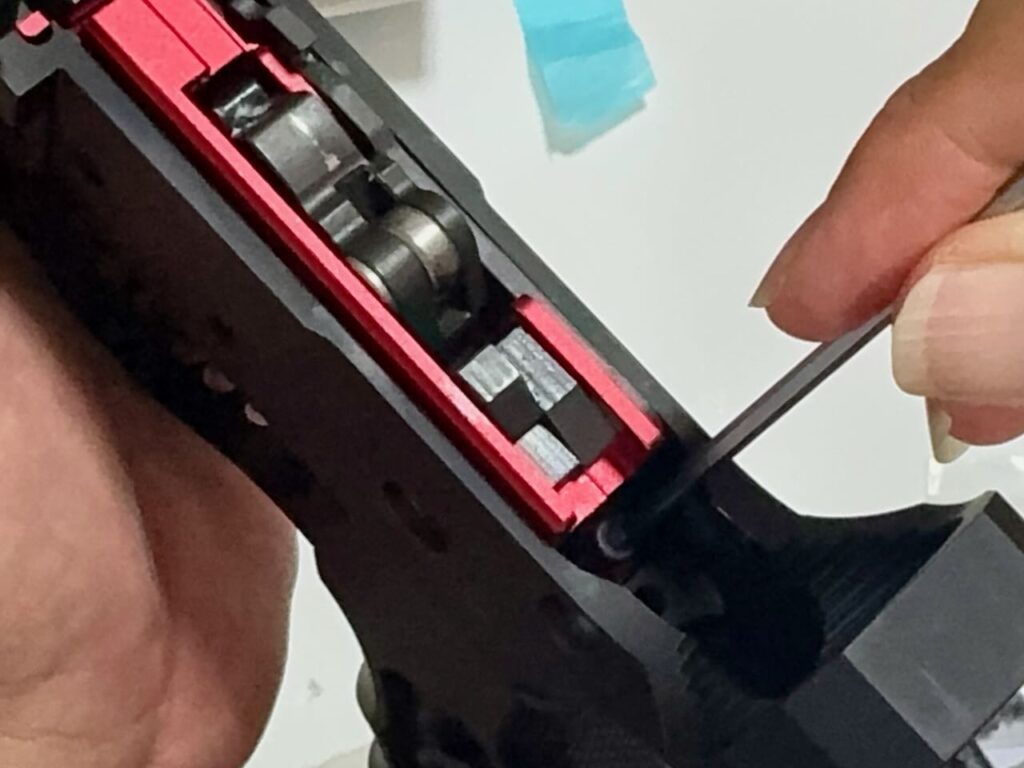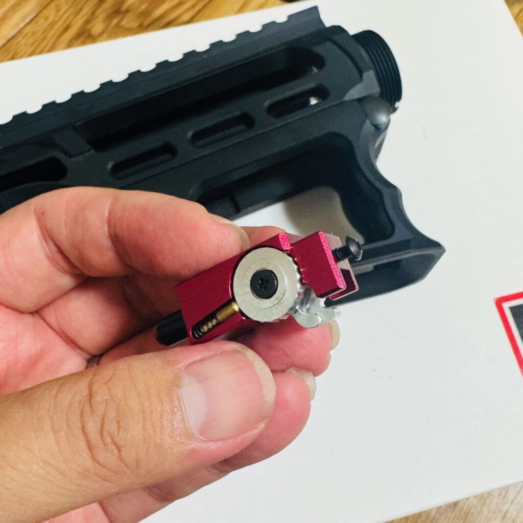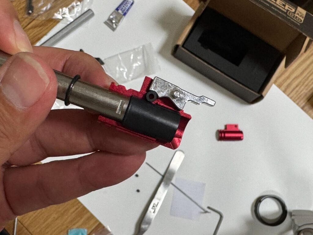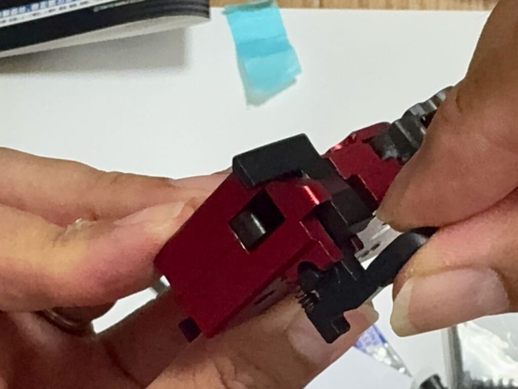 赤いという理由だけで決めた IRON AIRSOFTのアルミCNC ホップアップアジャスター。ホップアジャスターの前方のネジを外す。アッパーレシーバーの裏側の凹みにホップアジャスターを入れて前方へくっつける。アッパーレシーバーの前側の穴から外しておいたネジを入れてホップアジャスターを固定する。インナーバレルを取り付ける際にホップチャンバーのレバーがホップアジャスターのレバーの下にすんなり入るように、ホップ調整ダイヤルを前側へ目一杯回転させて最弱(レバーが開いた状態)にしておく。