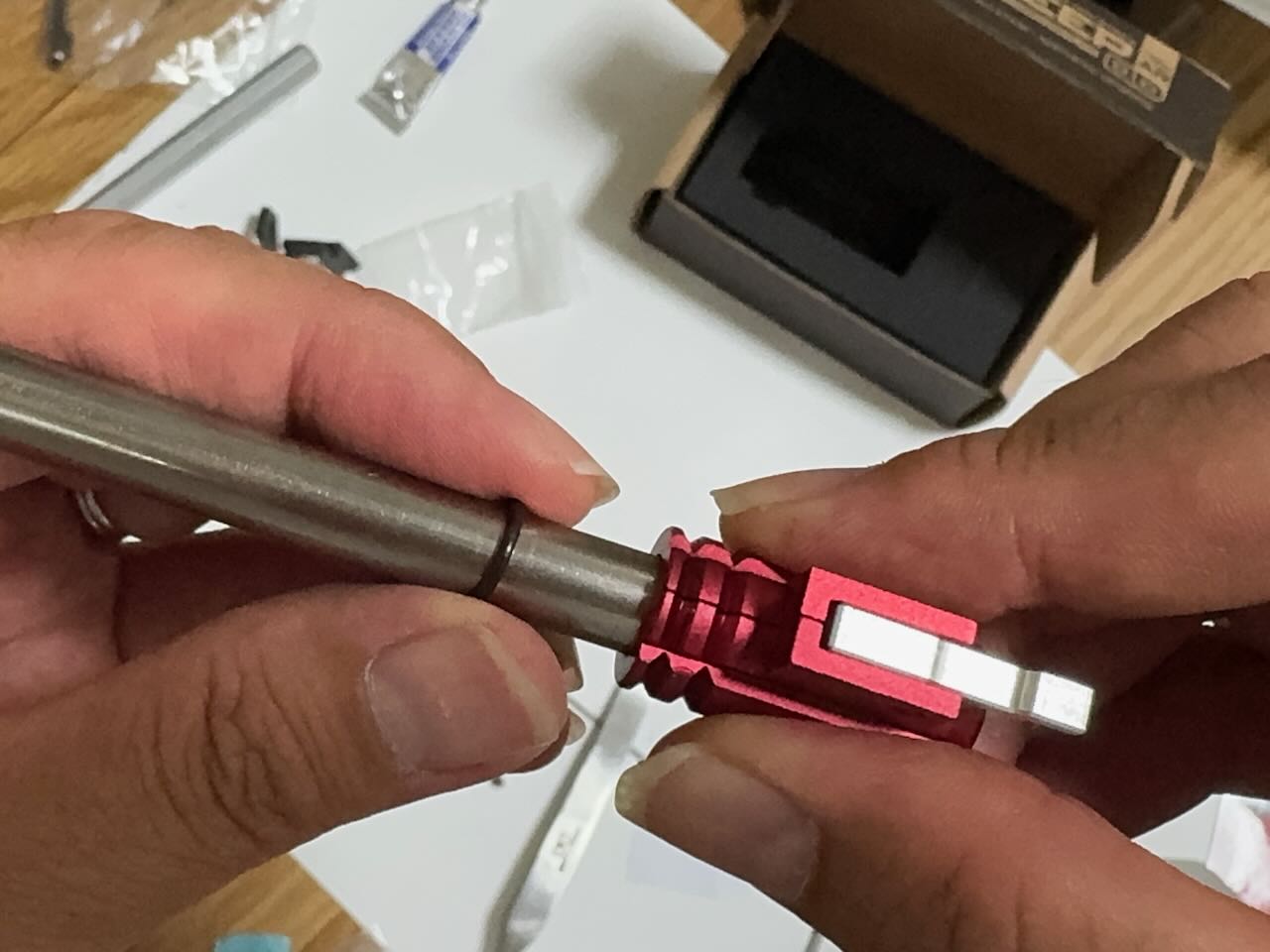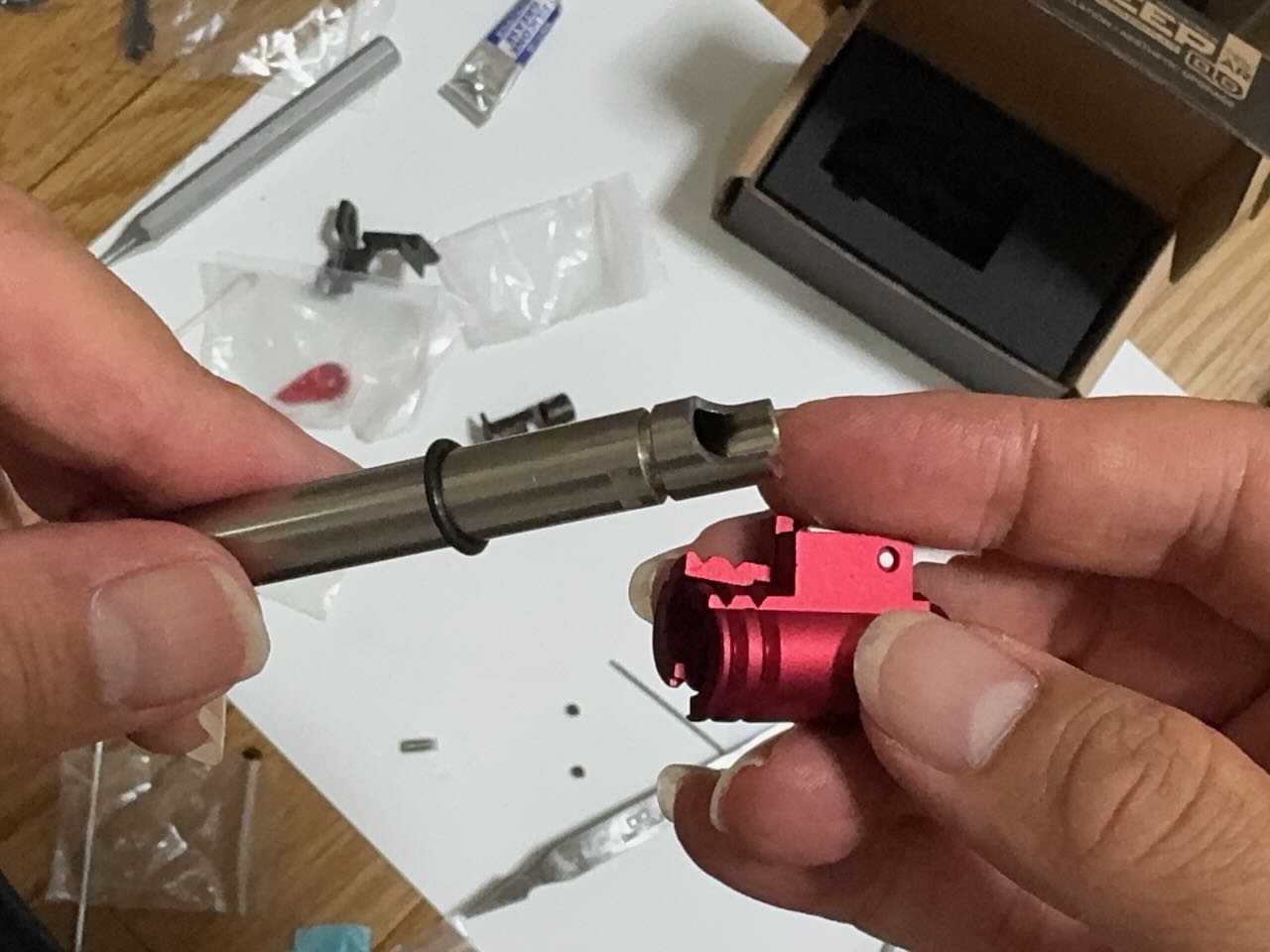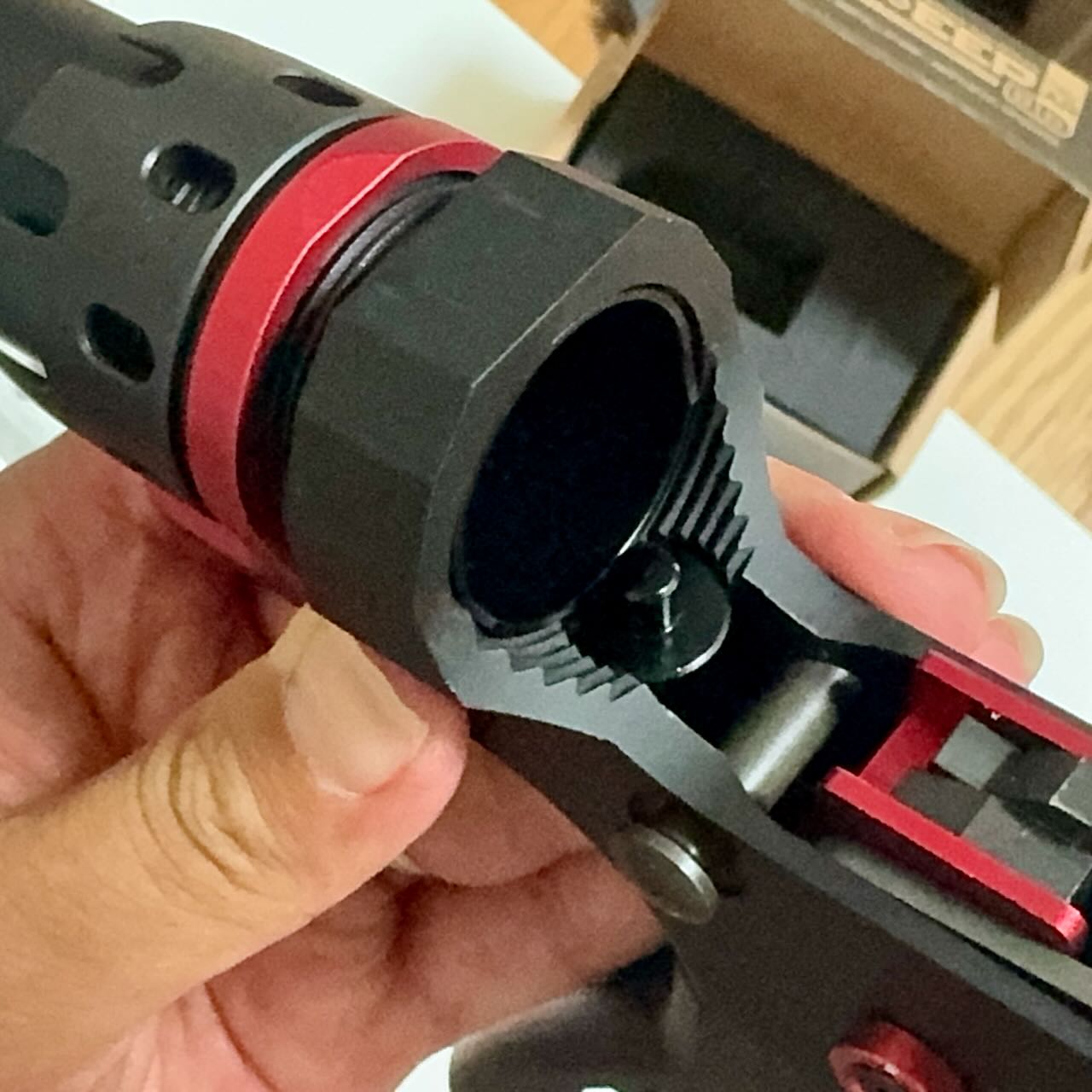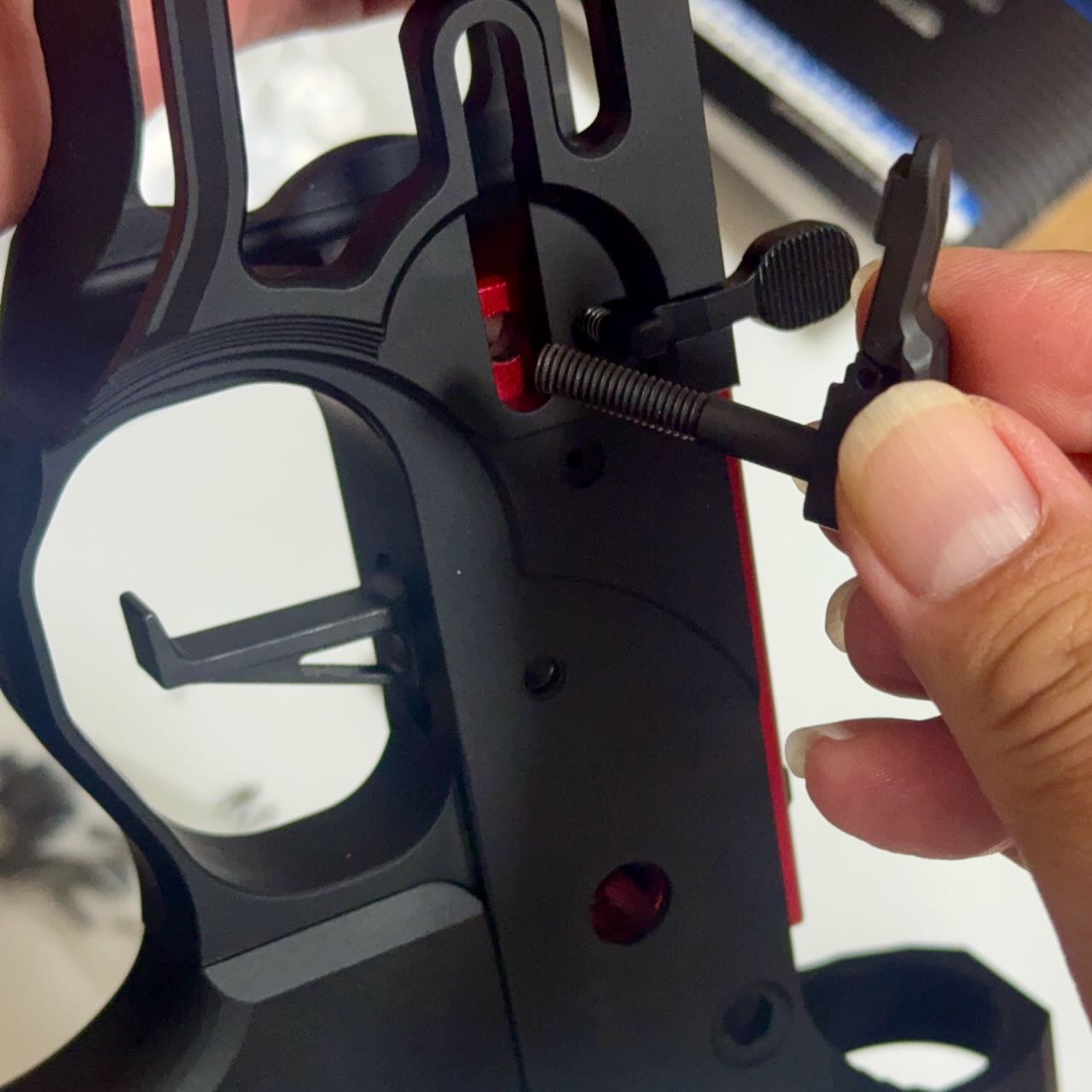 赤いという理由だけで決めた IRON AIRSOFTのアルミCNC ホップアップアジャスター。ホップアジャスターの前方のネジを外す。アッパーレシーバーの裏側の凹みにホップアジャスターを入れて前方へくっつける。アッパーレシーバーの前側の穴から外しておいたネジを入れてホップアジャスターを固定する。インナーバレルを取り付ける際にホップチャンバーのレバーがホップアジャスターのレバーの下にすんなり入るように、ホップ調整ダイヤルを前側へ目一杯回転させて最弱(レバーが開いた状態)にしておく。