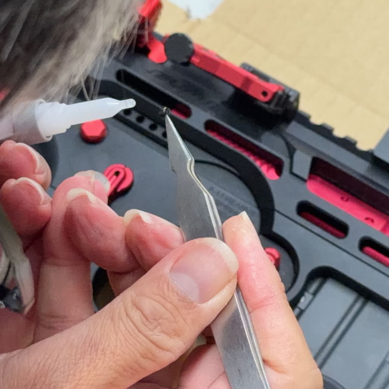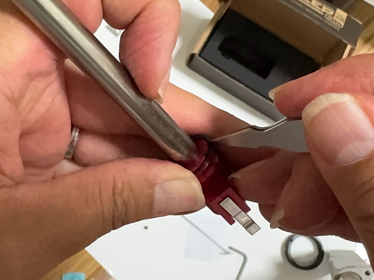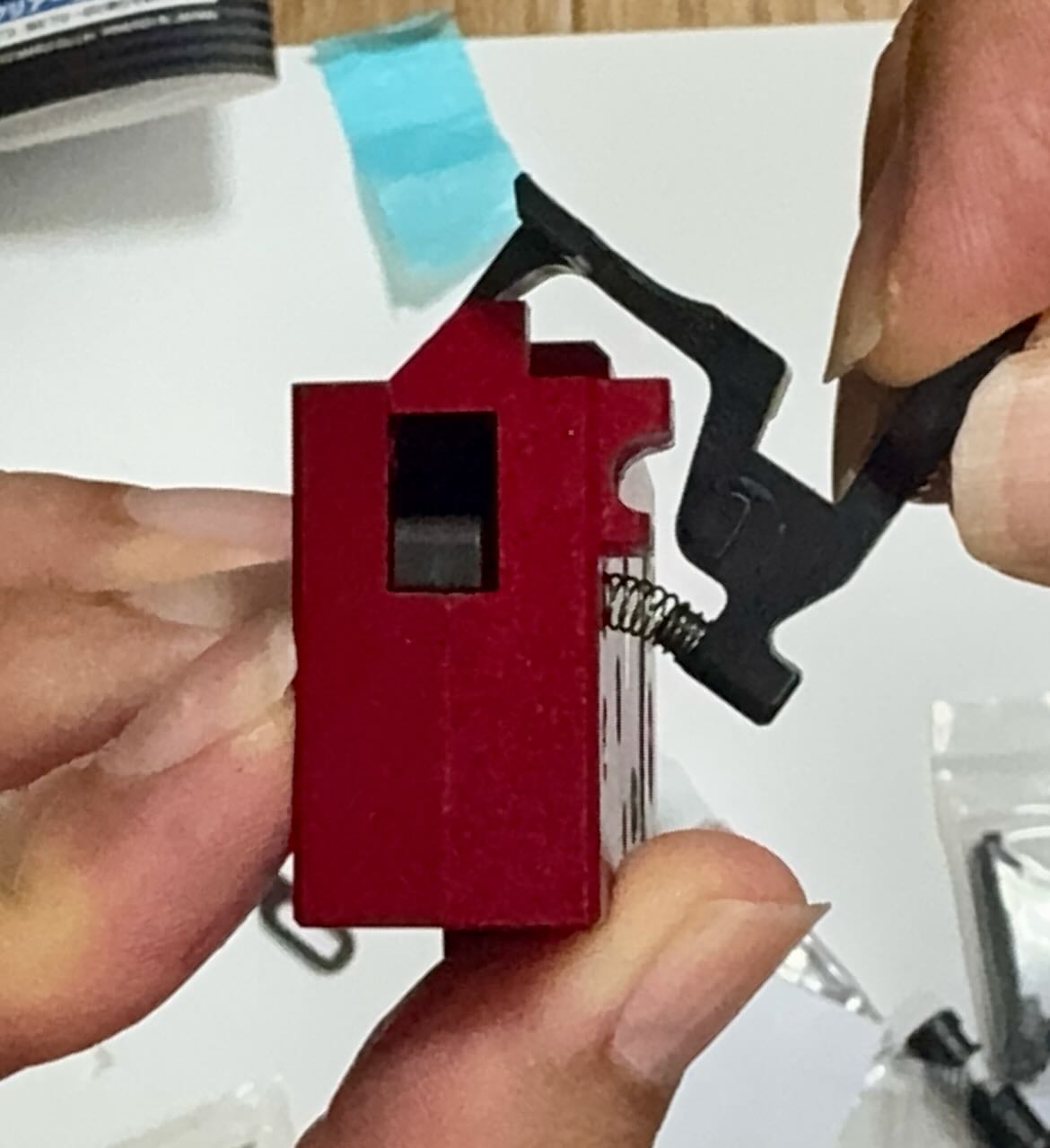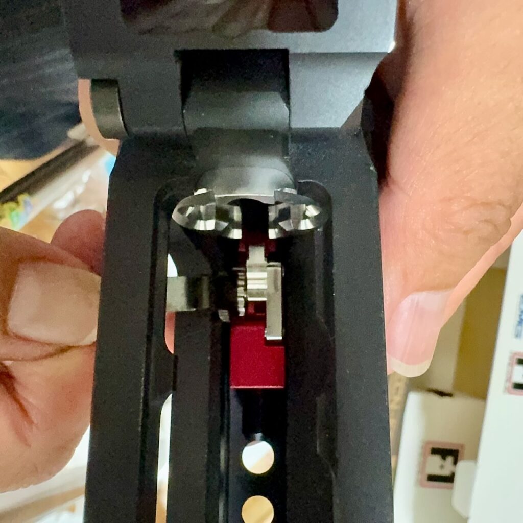 赤いという理由だけで決めた IRON AIRSOFTのアルミCNC ホップアップアジャスター。ホップアジャスターの前方のネジを外す。アッパーレシーバーの裏側の凹みにホップアジャスターを入れて前方へくっつける。アッパーレシーバーの前側の穴から外しておいたネジを入れてホップアジャスターを固定する。インナーバレルを取り付ける際にホップチャンバーのレバーがホップアジャスターのレバーの下にすんなり入るように、ホップ調整ダイヤルを前側へ目一杯回転させて最弱(レバーが開いた状態)にしておく。