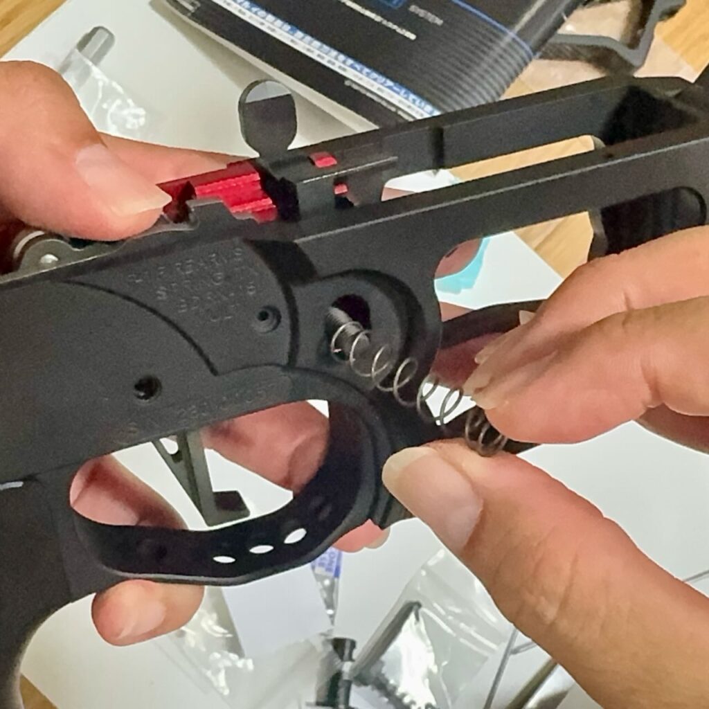 スプリングを指で軽く押さえてロックピンがテイクダウンピンの溝にハマっていい具合にカチッカチッと抜き差しできることを確認。エンドプレートを取り付けるまではスプリングを押さえておくものがないのでピンとバネがどっかに飛んでいかないように注意。