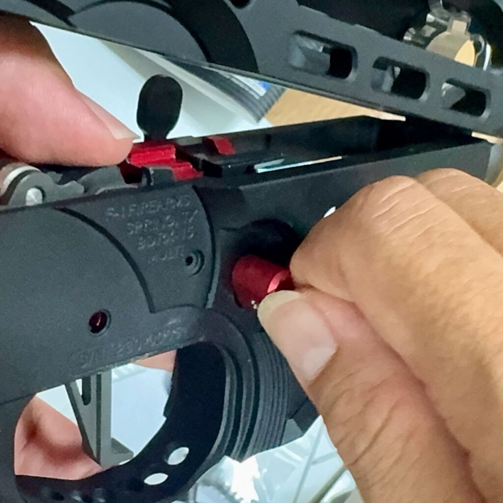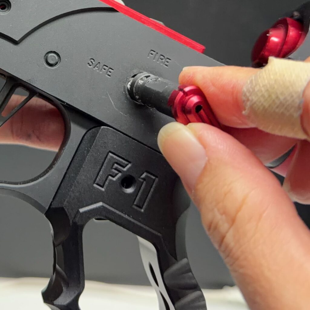 左側から穴にセレクターを差し込んで途中でトリガーバーやロックピンがうまく溝にハマるようにセレクターを右や左に回転させながら押し込んでいく。