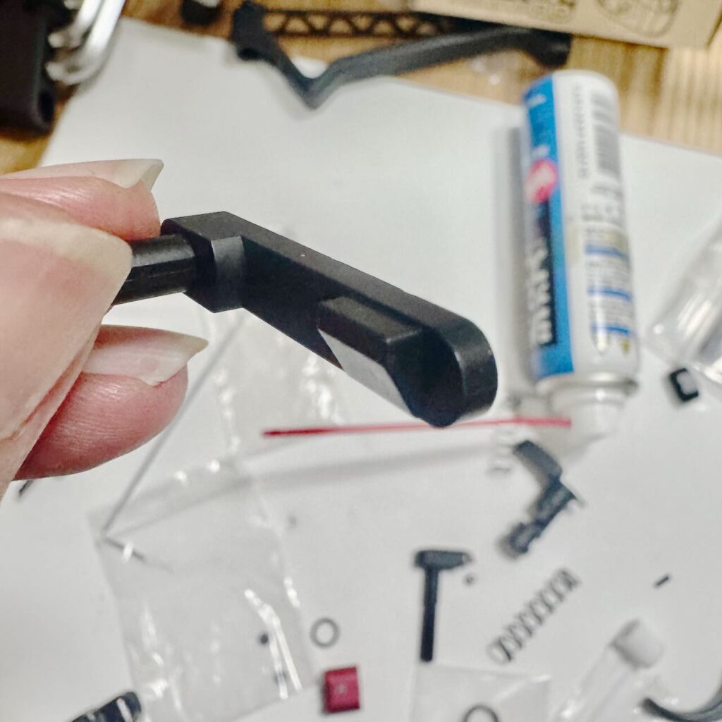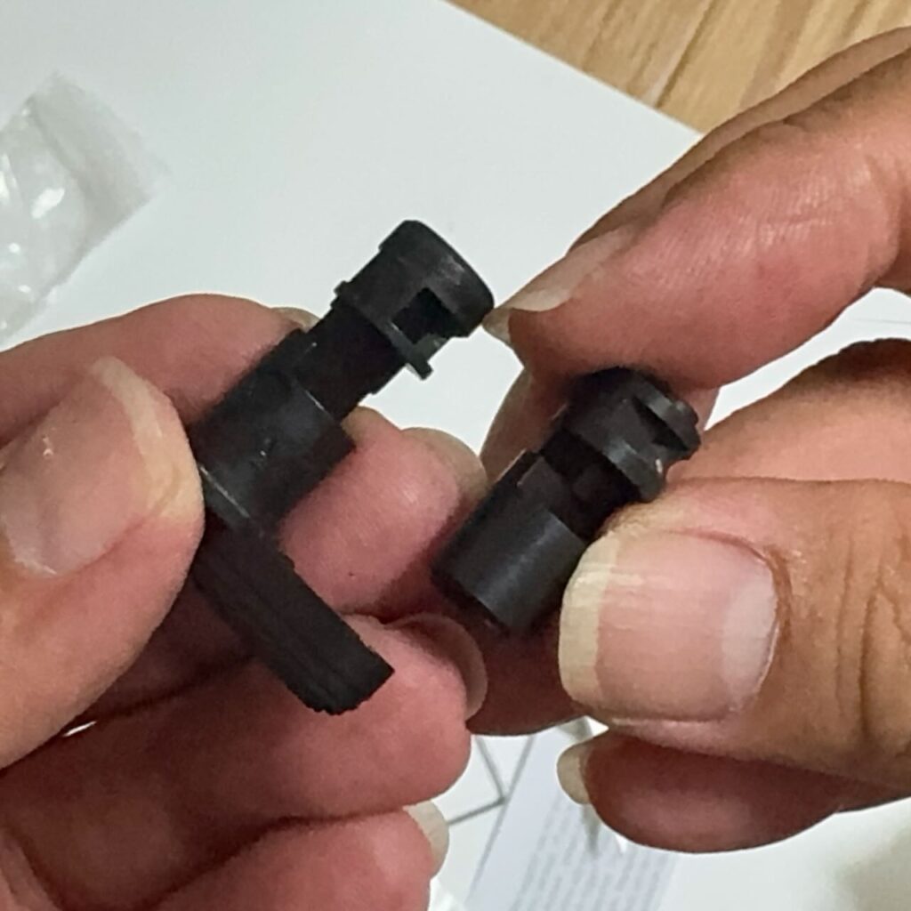 東京マルイ純正パーツの形をよーく観察して軸の向きを確認して左側面になる方にレバーを取り付ける。軸に横からレバーをスライドさせて回転軸中央の穴に六角レンチを入れたら奥にあるイモネジをゆるめて手前に引き出すとレバーが固定できる。中にあるイモネジを引き出してレバーを留めるタイプは知らなかったので気づくのにだいぶ時間かかった。エアガンパーツって説明書が付いてないから使い方がわかりにくいのが多い。